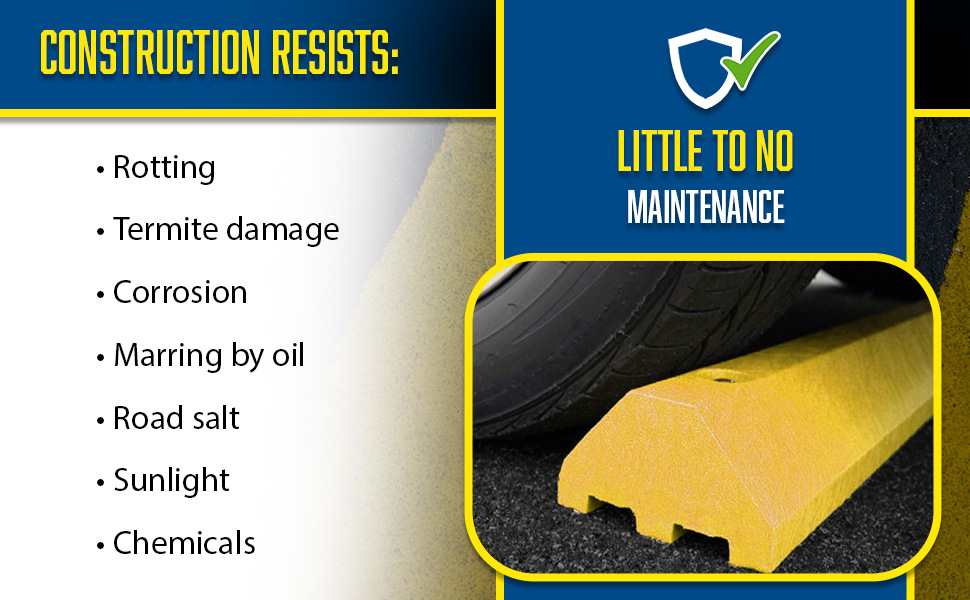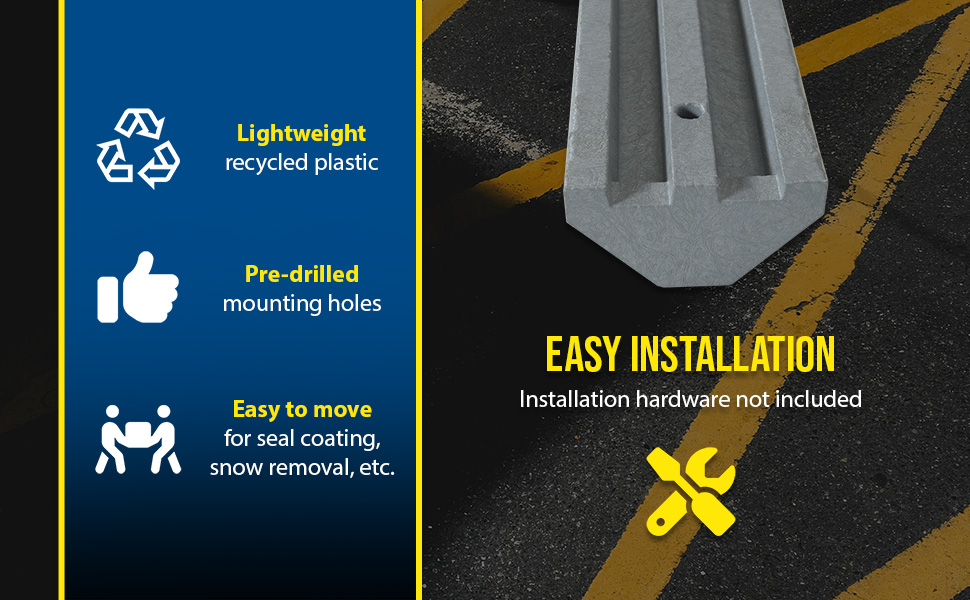 Made of solid (no channels) recycled plastic. High-visibility colors enhances driver and pedestrian safety. Solid parking blocks are chemically formulated plastic that offer durability, virtually indestructible, user-friendly, easy to install, maintenance free, lightweight but stable, chemical and weather resistant, UV stabilized.