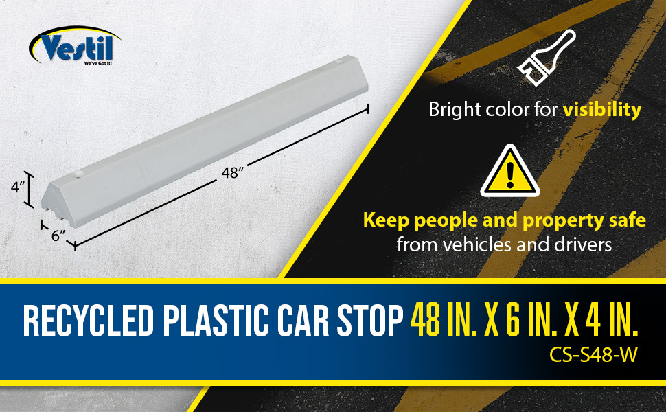 CS-S48-W CS-S48-WRecycled Plastic Car Stop 48 In. x 6 In. x 4 In. WhiteMounting Holes (qty.): 2