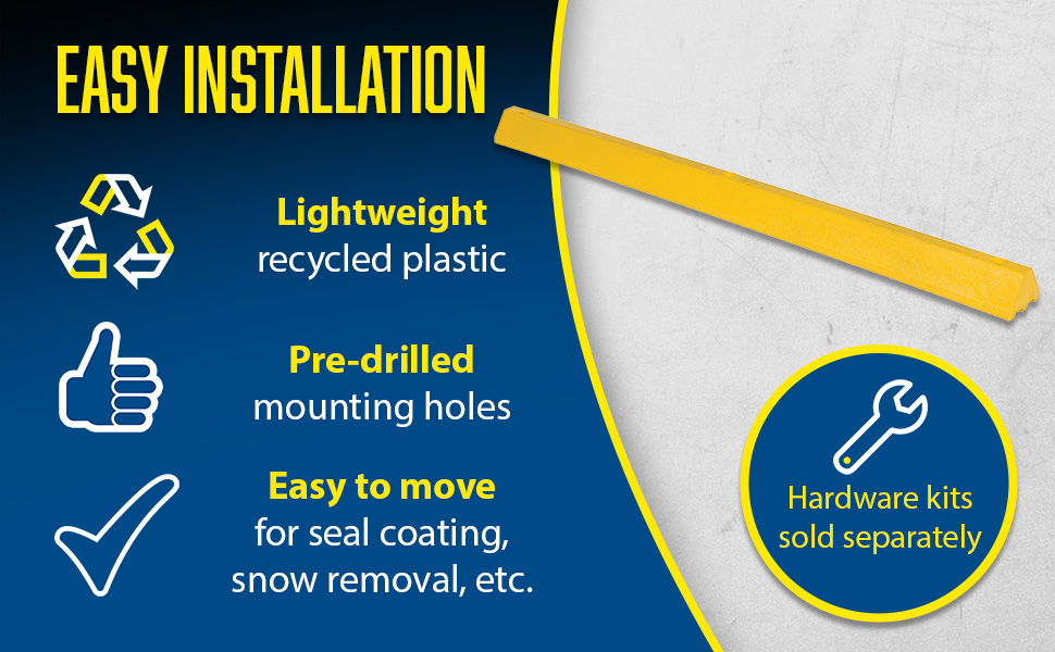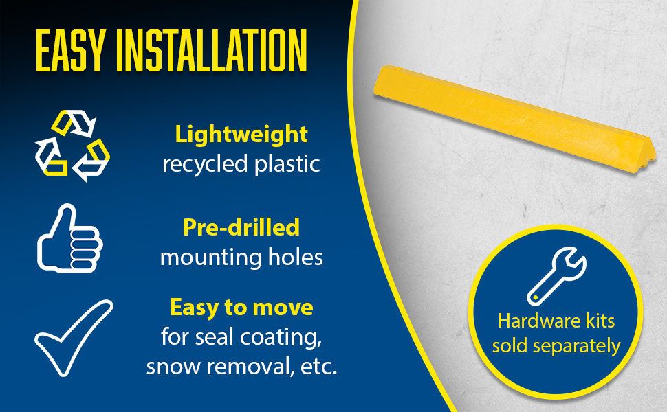 CS-C-72-GRN_A.jpgProtect people and property from drivers in dangerous areas. Constructed of lightweight recycled plastic. One person installation. Can be removed for seal coating, snow removal, or change of location. Resists marring by oil, road salt, sunlight, and chemicals. Resists rotting, termite damage, and corrosion. No costly painting or maintenance. High-visibility color enhances driver and pedestrian safety. Mounting holes are pre-drilled for a quick installation process. Hardware kits are available separately.