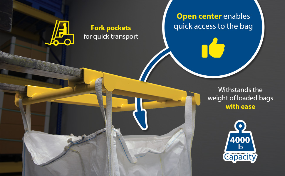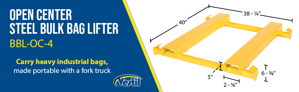 | BBL-OC-4 | ![]() | 1 Year Limited Warranty | Steel Bulk Bag Lifter Open Center 4000 lb. Capacity Yellow | Uniform Capacity (lbs.): 4000 Fork Pocket (Width): 5" | 123 | ||