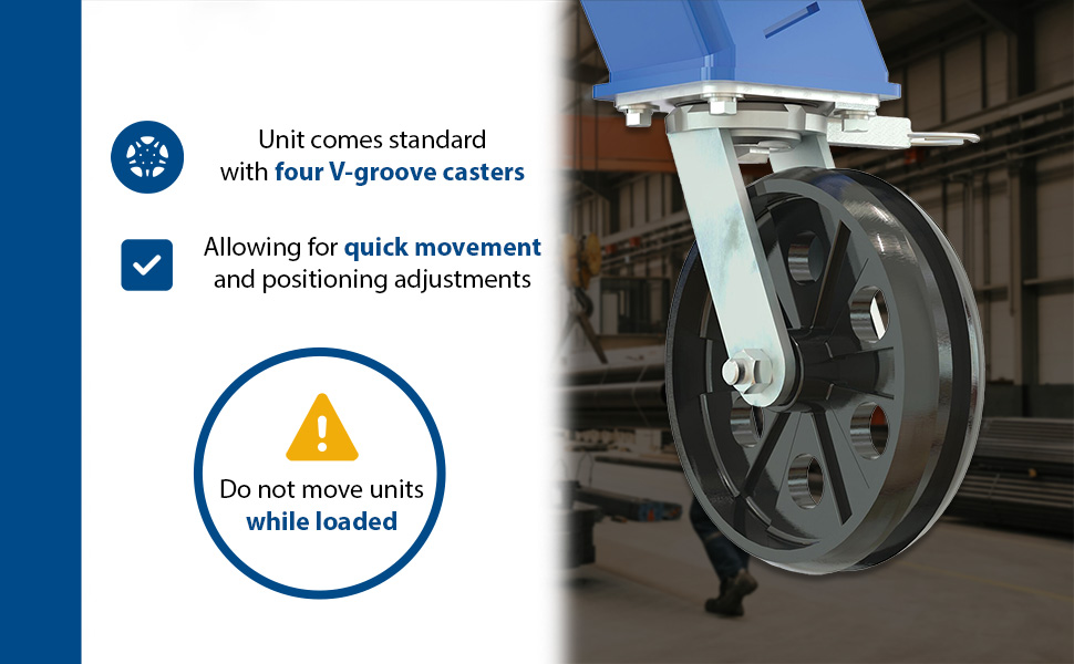 The adjustable height steel gantry crane is designed for transporting and positioning materials along the beams length. The cranes beam height can be adjusted to better conform to the working conditions making it both ergonomically friendly and cost effective. Unit comes standard four (4) V-groove casters, allowing for quick movement and positioning adjustments. Height is adjustable in 6" increments. Designed for semi-permanent or permanent applications. Do not move units while loaded unless using V-Groove Caster and Track Option. Hoists & Trollies can be ordered seperately.