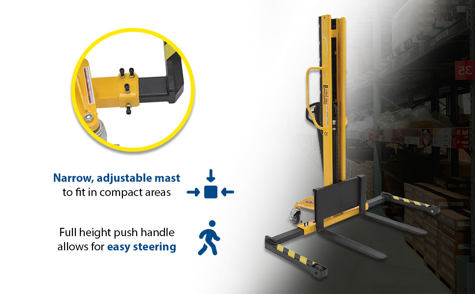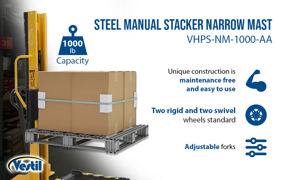 VHPS-NM-1000-AA VHPS-NM-1000-AASteel Manual Stacker Narrow Mast Adjustable Forks/Legs 1,000 Lb. Capacity Black / YellowUniform Capacity (lb.): 1,000