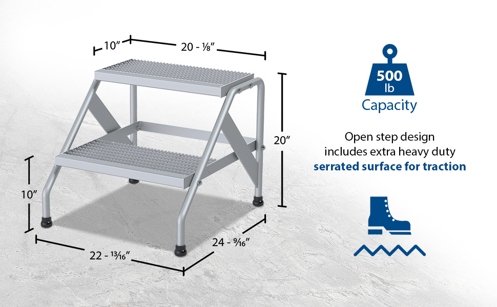 | Aluminum 2 Step Wide Stand 500 Lb. Capacity Silver | Uniform Capacity (lb.): 500 Number of Steps: 2 | 19 |