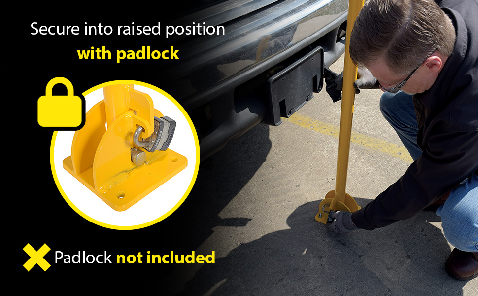 Folding steel barrier post for parking control and security. Bollard is locked in the raised position with a padlock (padlock not included). When padlock is removed, bollard may be lowered to ground to allow for access. Base plate must be lagged to ground for proper installation (installation hardware not included). Steel construction. Powder coat yellow or galvanized finish.