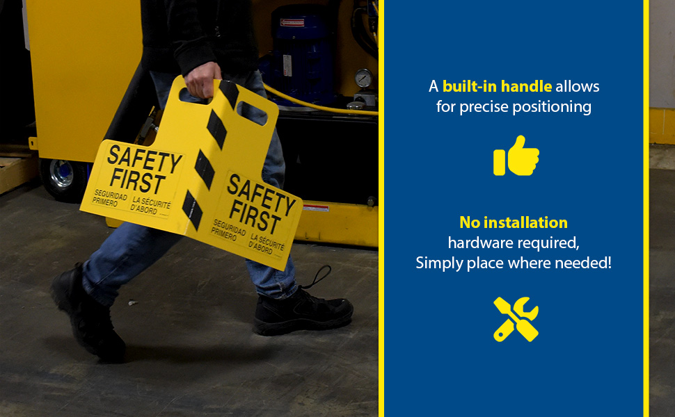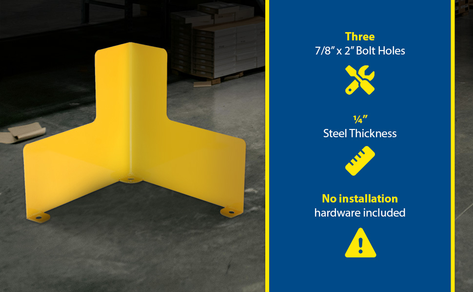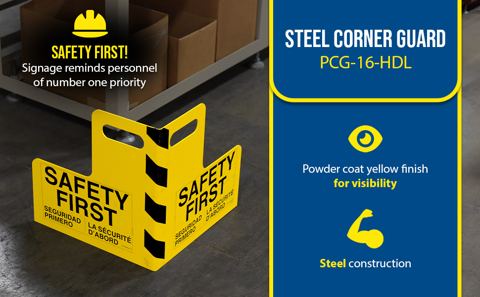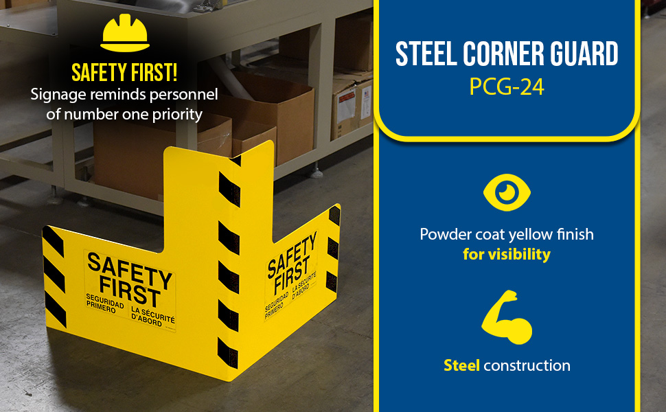 Protect busy corners, expensive machinery and personnel with 90 degree perpendicular protection. "SAFETY FIRST" promotion reminds personnel of the number one priority. Steel units include a baked in powder coated yellow finish for added toughness.