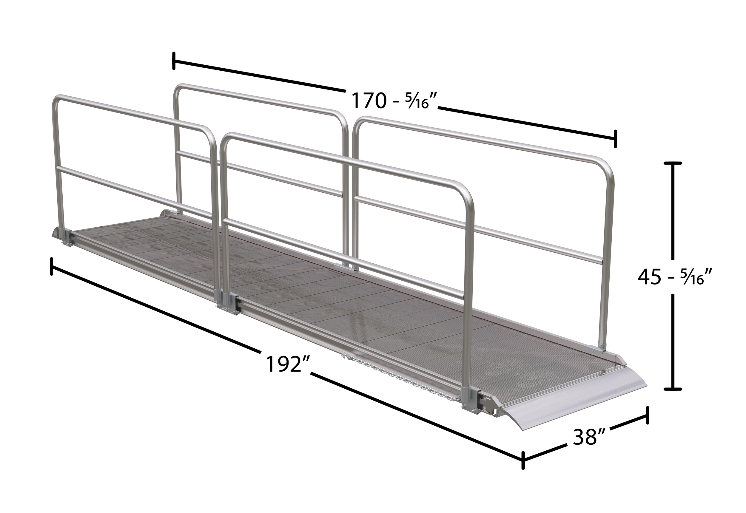 Aluminum Wheel Walk Ramp Overlapping Style with Handrails 192 In. x 38 In. 1000 Lb. Capacity SilverThe Aluminum Walk Ramp with hand rails enables delivery men/women, shippers, and receivers to load and unload trucks when docks are unavailable. Heavy-duty steel chains with steel grab hooks are attached to each side of ramp for safely securing ramp to truck. Constructed of strong aluminum alloy with non-skid tread surface. The ramp is lightweight and easy to handle. This overlapping style rests on the truck bed.