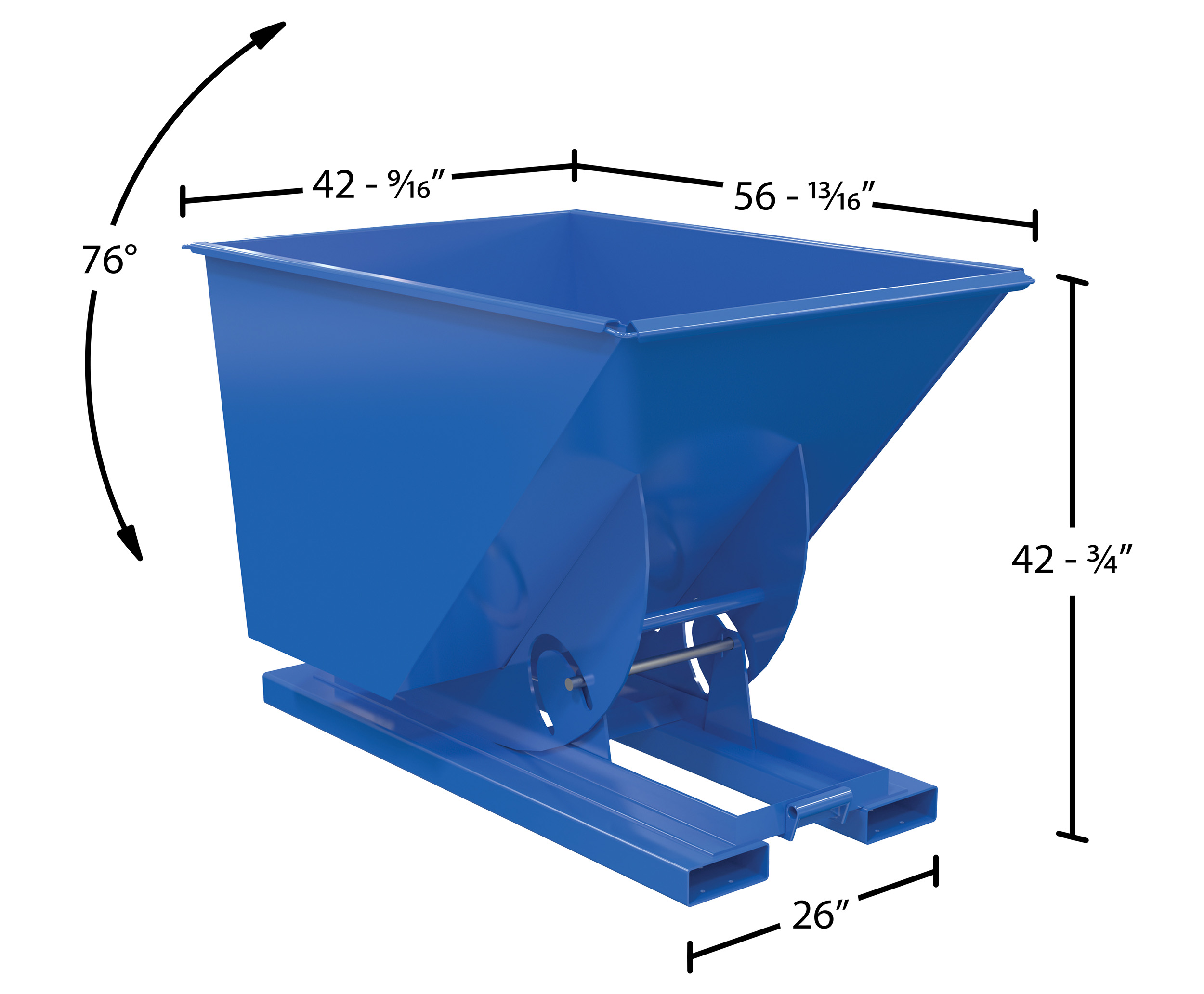 Steel Heavy Duty No Bump & Dump Hopper 1 Cubic Yard 6000 Lb. Capacity BlueThis steel Hopper is the perfect resolution for loading and unloading large amounts of items. With a steel construction, the hopper maintains a structural strength that endures the strain of consistent daily use. The manual release feature gives the forklift driver the ability to never leave the driving position, which allows personnel to stay at a safe distance throughout the dumping process. In addition to the smooth surface, the contoured edges let items flow freely out of the hopper for a complete clearing of loaded goods.