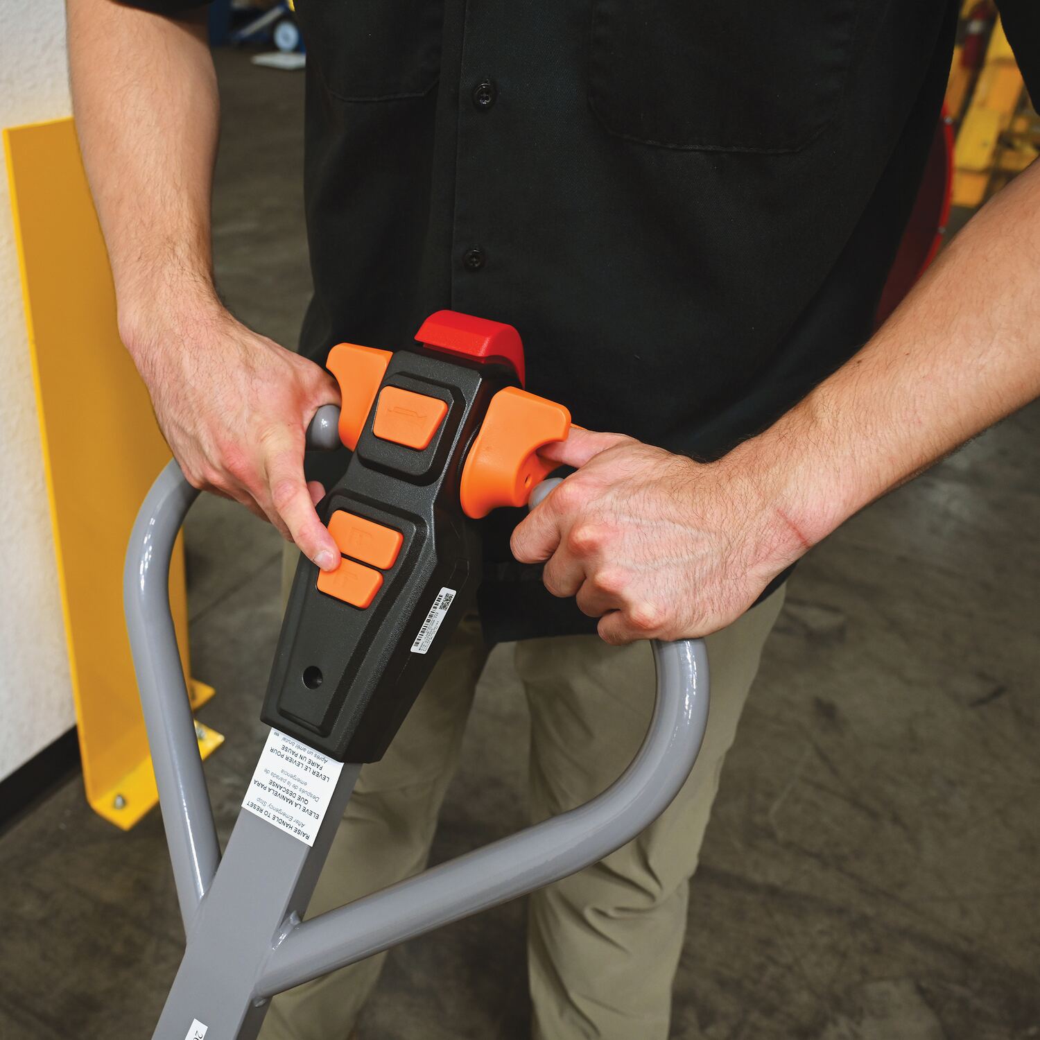 Steel Electric Pallet Truck With Powered Brakes 27 In. x 45 In. 3,300 Lb. Capacity Black/RedThe electric pallet truck is the perfect change from the manual design. This construction design is built to last, withstand rugged daily use, and diminish manual labor. Multi-function capabilities such as the raise and lower buttons and emergency brake are located in the handle. The design of the handle is also ergonomically friendly, minimizing awkward slouching when maneuvering. All areas are easily accessible for general upkeep and cleaning. Truck can be used with the handle in the upright position for utilization in the small areas. Horn is also included. This model includes powered brakes, which lessens strain on workers and increases workplace safety.