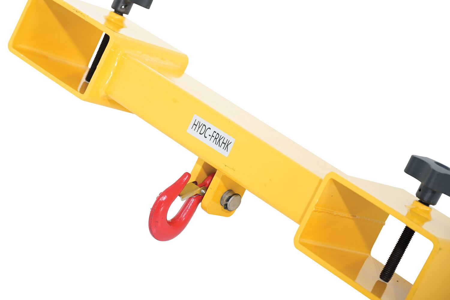 The hook attachment is designed of a strong construction for lifting awkward heavy products. A simple installation allows the user to obtain immediate use of the hook and start maneuvering products. A bright yellow finish promotes safety and visibility while transferring units.