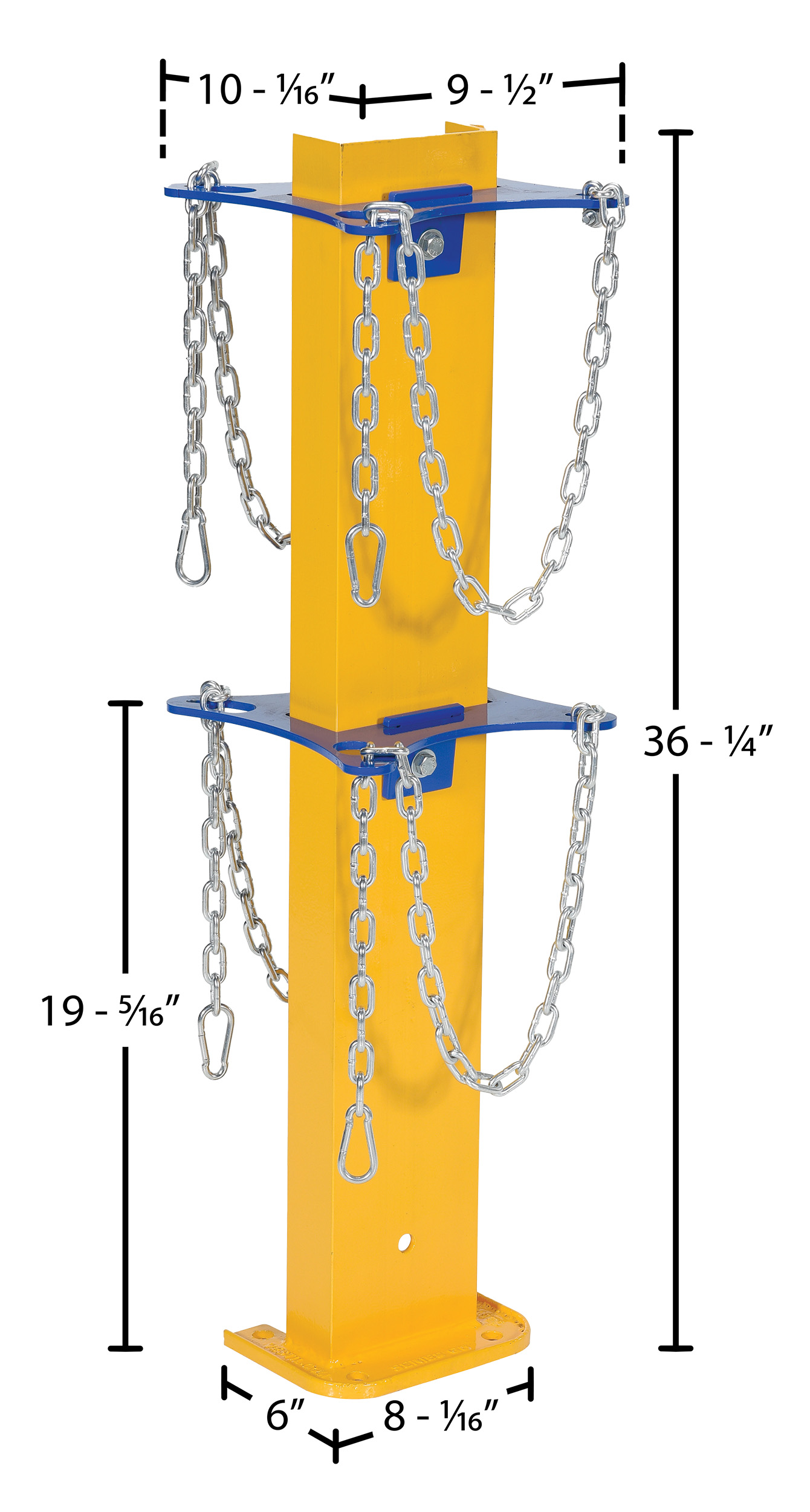 Steel Cylinder Storage Stand 9-1/2 In. x 10-1/16 In. x 36-1/4 In. Yellow/BlueA cylinder storage stand is great for additional cylinders that are both used and unused. The sturdy steel construction with a bright yellow and blue finish endorses visibility of the unit, both near and far. Two cylinders are able to be stood in a secure position due to the shaped steel and safety chain. The unit can be secured to the floor by utilizing the pre drilled mounting holes at the base of the stand.