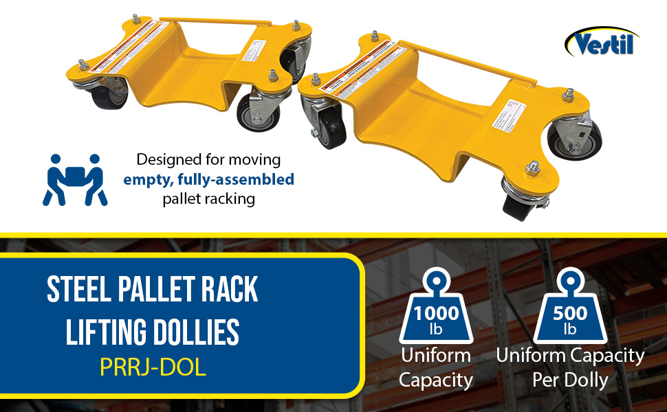 • Pallet rack lifting dollies are designed for moving empty fully-assembled pallet racking