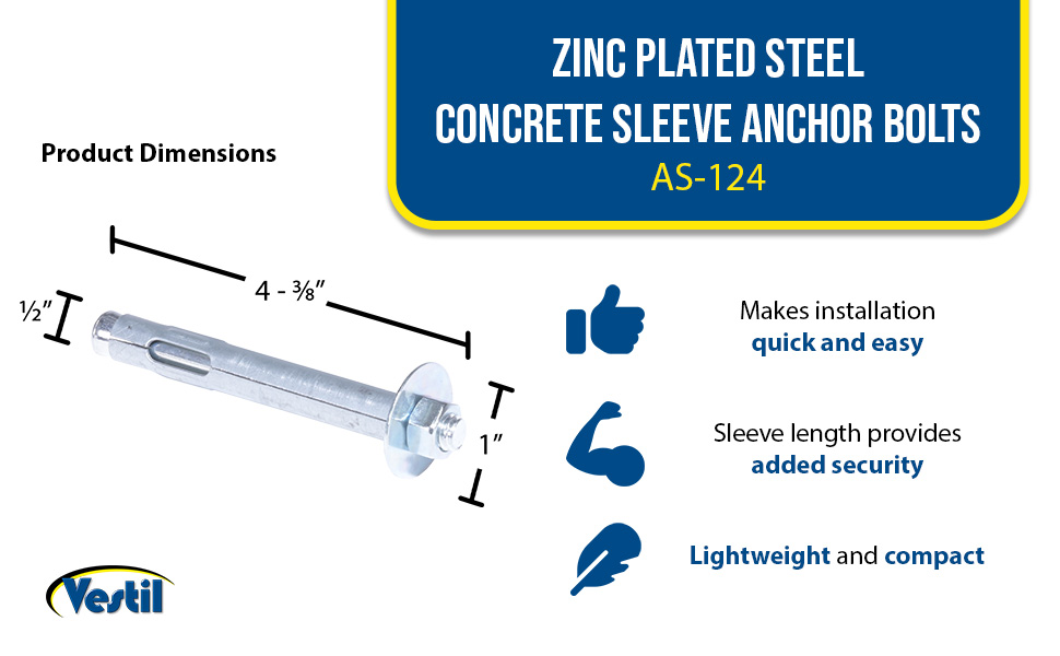 AS-584-12PK AS-584-12PKSteel Concrete Sleeve Anchor Bolts 12 Pack 5/8 In. x 4 In. SilverPieces in Package (qty.): 12