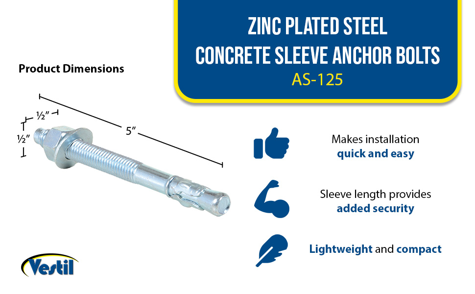 AS-125-8PK AS-125-8PKSteel Concrete Sleeve Anchor Bolts 8 Pack 1/2 In. x 5 In. SilverPack (qty.): 8