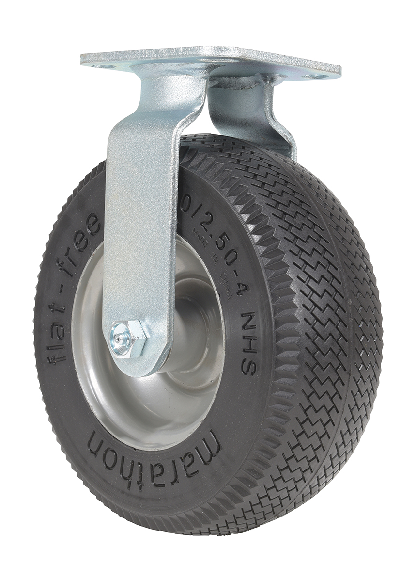 The foam-filled caster provides the same shock absorbent cushion ride a pneumatic does without the worry of flat tires and refilling air. Ideal for outdoor applications.