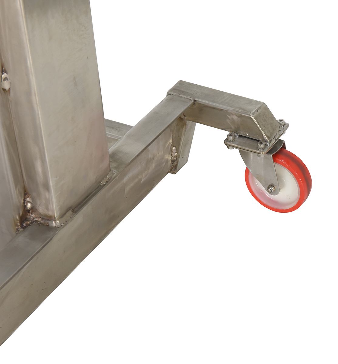 If a meat buggy makes moving items easy, then the meat buggy lifter/transporter makes moving large quantities even easier. The straddling dual arms of the lifter help secure the unit in place. Once in place, the user can utilize the hand winch to lift or lower the buggy to the desired height. For transporting, the unit rolls smoothly on casters, while the upright driving handles help steadily steer. Stainless steel open design is simple to wash-down and clean after use.