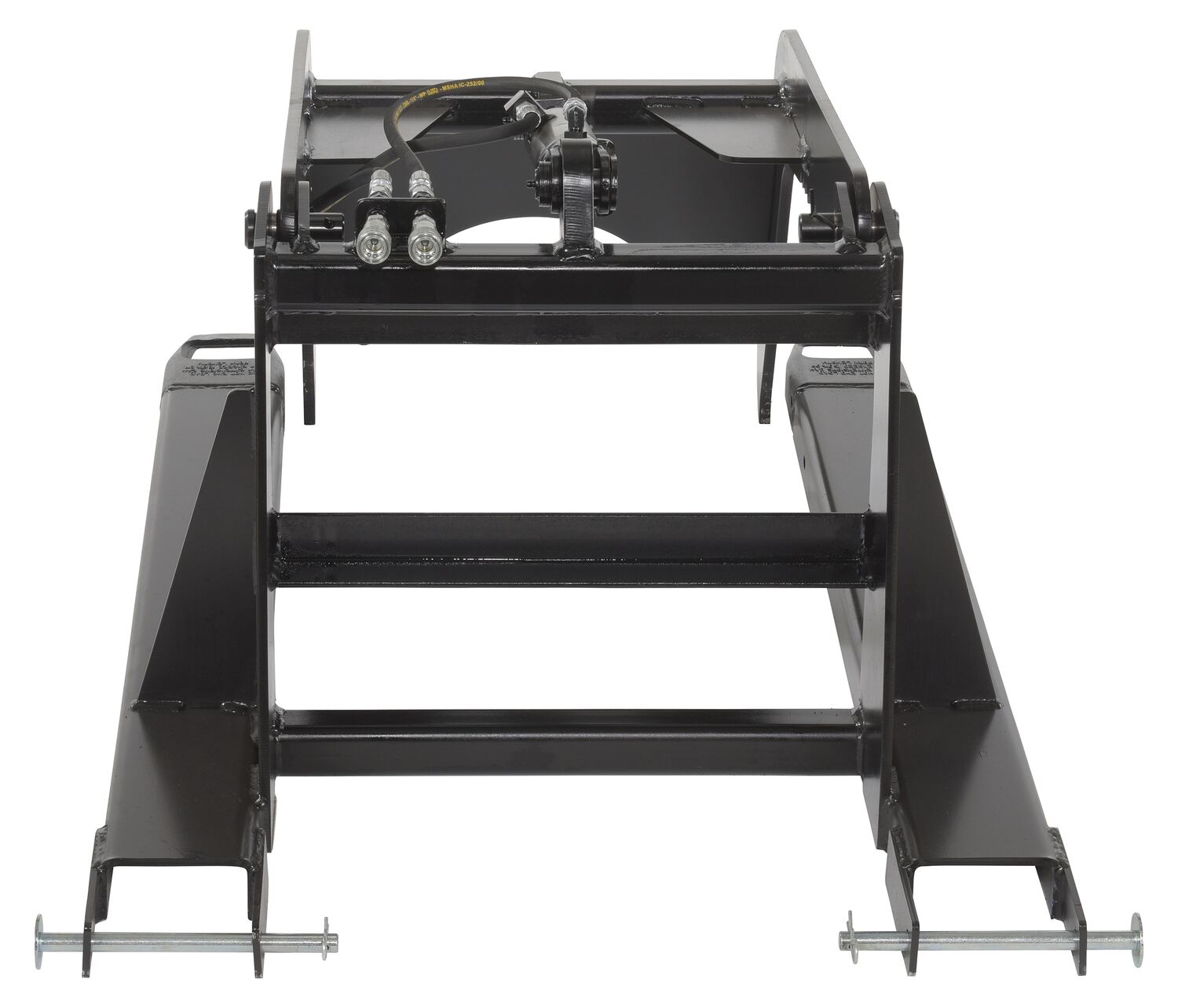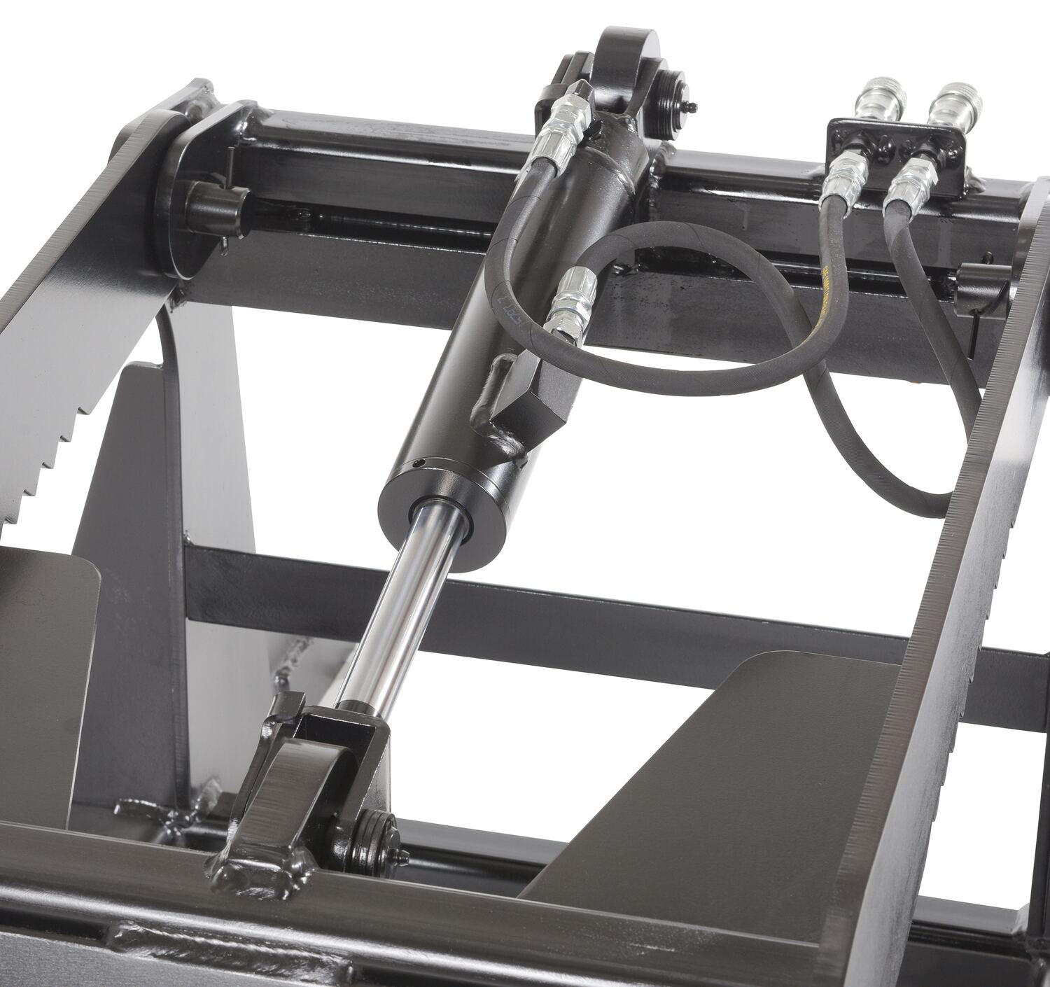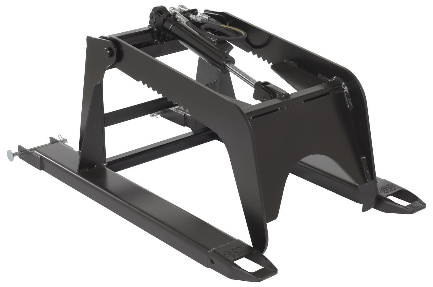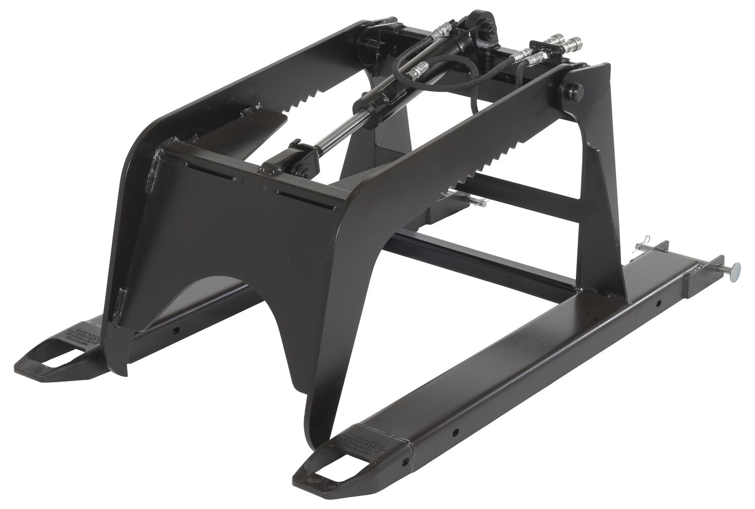 A material grapple attachment helps secure round or oversized items. With an arched two arm design, needless product movement is minimized during transference between areas. The top two arms also have a saw-like pattern for increased control during loading and unloading. The functionality of the unit is executed by use of hydraulics. The grapple includes a steel frame with a liquid paint finish.