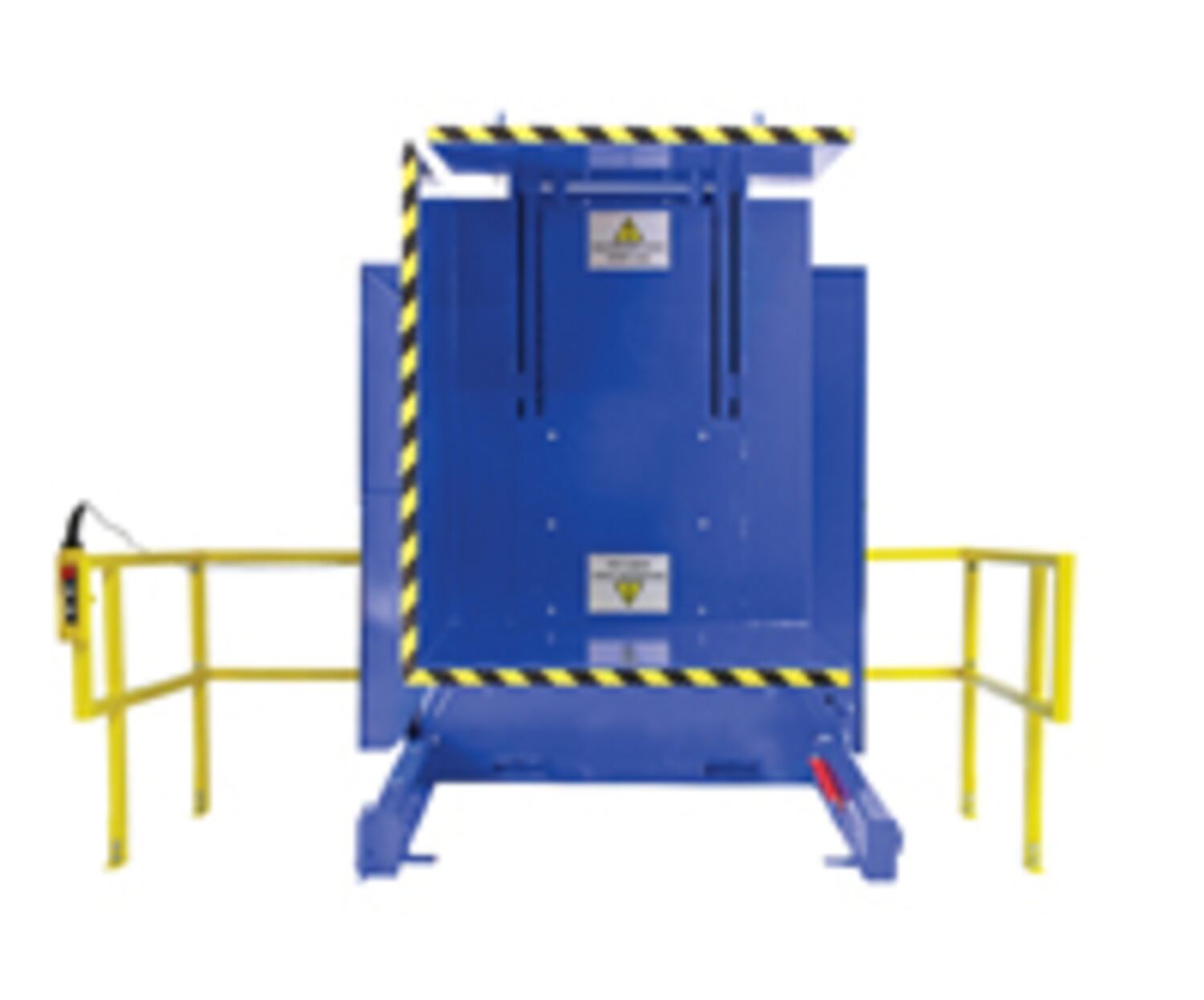 Pallet Inverters help reduce your costs in production, storage, retrieval and distribution. The 180 degree rotation makes pallet exchange quick and simple while reducing product damage. Easily load and transfer from wood pallet to plastic pallet, slip sheet or rental pallet. Units can be loaded and unloaded easily with a fork truck. Uniform capacity is 4,400 lbs. Steel hand rail guarding standard. Special sizes, mesh guarding and CSA versions available, please contact factory. Units ship flatbed truck.
