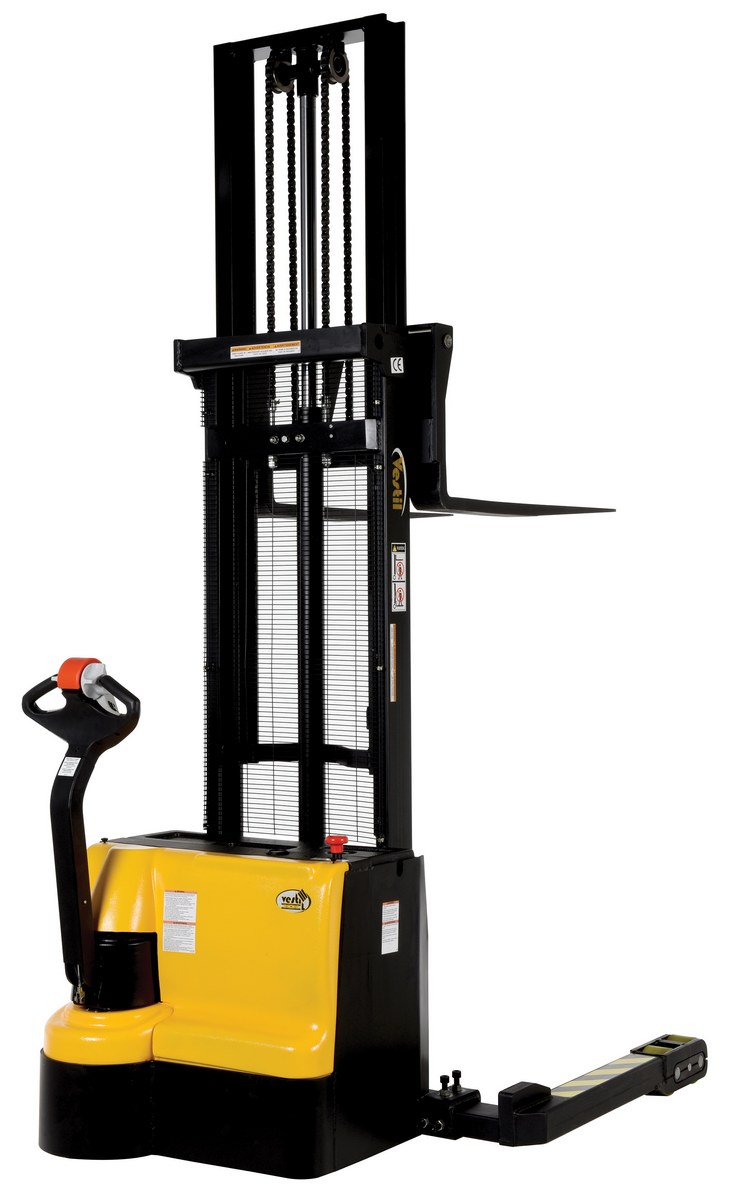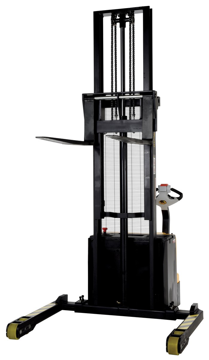 Double Mast Fully Powered Electric Stacker transports loads throughout warehouse facilities quickly and with less effort. High torque 24VDC drive and lift motor handles heavy-duty jobs. Ergonomic handle features easy-to-operate throttle with infinite adjustment of forward and reverse speeds, lift/lower controls, proprietary safety-enhancing emergency reverse function, and horn. Includes an electromagnetic disc brake with automatic dead-man feature that activates when user releases the handle. Powered lifter has two 12V lead acid deep cycle batteries, integral battery charger, and battery level gauge. Stacker rolls smoothly on poly-on-steel steer and load wheels. Feature 1.0 KW drive and 2.0 KW lift motor. 3-4 hour operation at full charge - 8 hours when used intermittently.