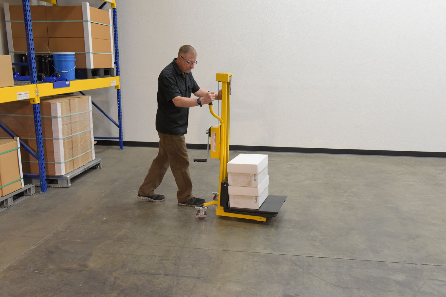 This lift is easy to maneuver with 4" x 1" wheels, two rigid, two locking swivel. Features a removable platform with adjustable forks underneath for increased versatility. Platform size is 21" wide by 19-1/2" long. The handle length on the hand crank may be adjusted to increase or decrease lifting/lowering speeds. Lifts 2-1/2" per rotation.