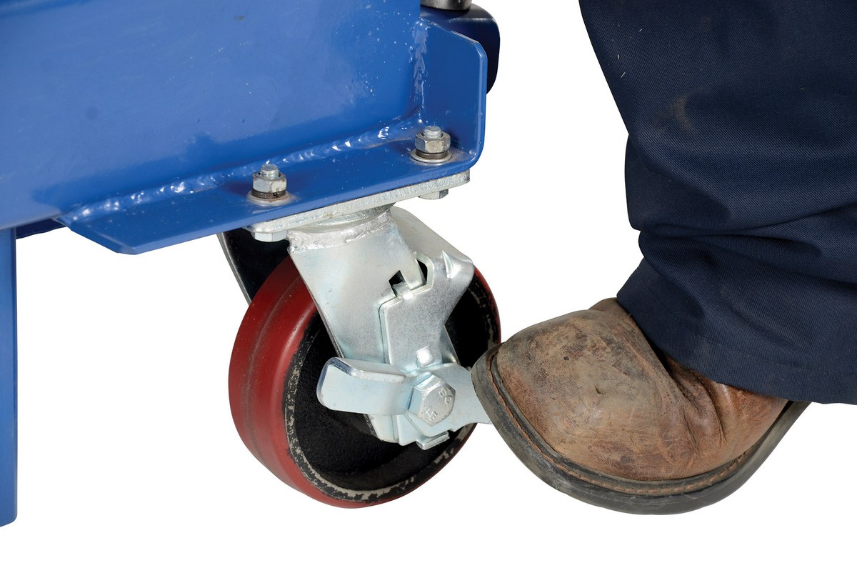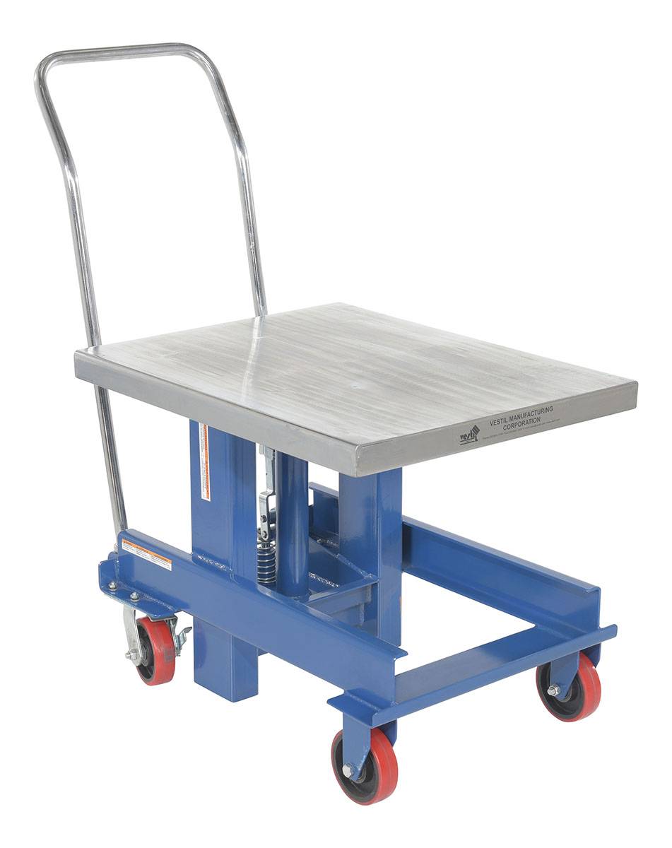 Designed to reduce back injury and cumulative trauma disorders. Lifts heavy equipment to dynamic working height. Foot pump operated hydraulic pump and lift cylinders. All welded steel construction will provide years of service and hard work. Small frame size allows unit to access hard-to-reach locations. Two rigid and two swivel with side brake casters. Suffix "C" represents a chrome top platform on foot pump operated models.