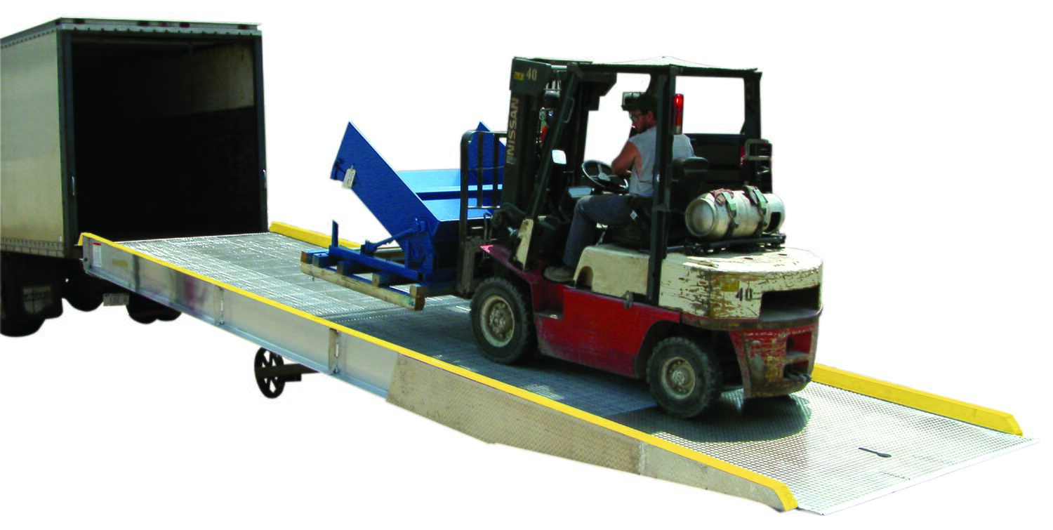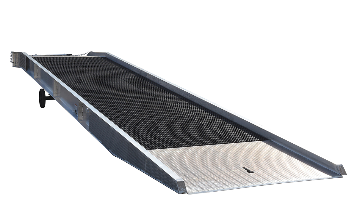 yard_r79.jpgPortable Aluminum Yard Ramps have a unique design that allows one person to position the ramp, adjust its service height, and load or unload trailers from ground level. Available with steel or rust resistant aluminum grating. Standard features: Manual hydraulic hand pump (safety pressure relief valve),18" x 5" mold-on-rubber tires, 4" high curbs, service range of 45" to 62", anchor chains, and tow bar pocket. Yard ramps ship flatbed truck. (Yellow guards are optional)