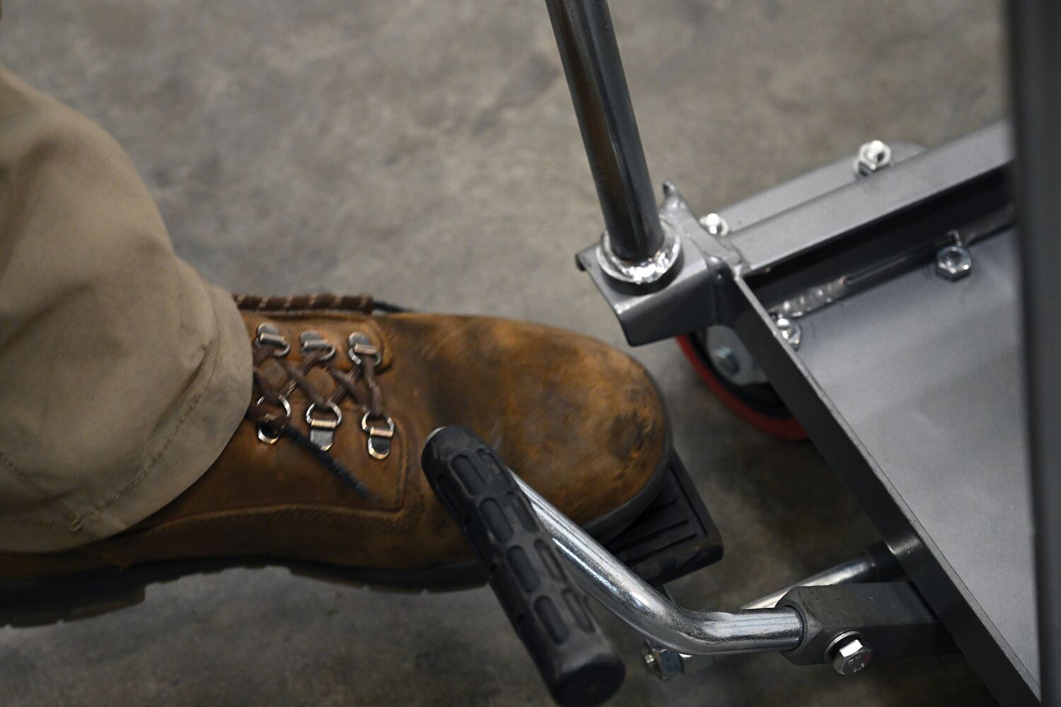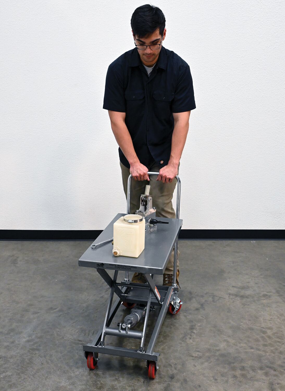 The Hydraulic elevating cart minimizes worker bending and lifting through its ergonomic design and portability. Material can be easily loaded onto a cart from a table, lowered to a safe transporting height, and raised to unload at destination.