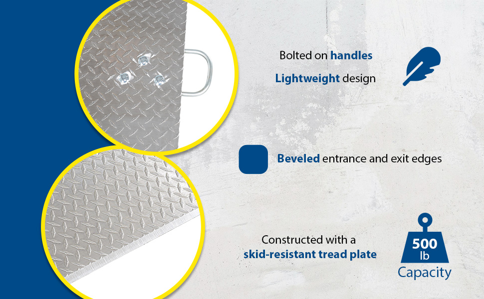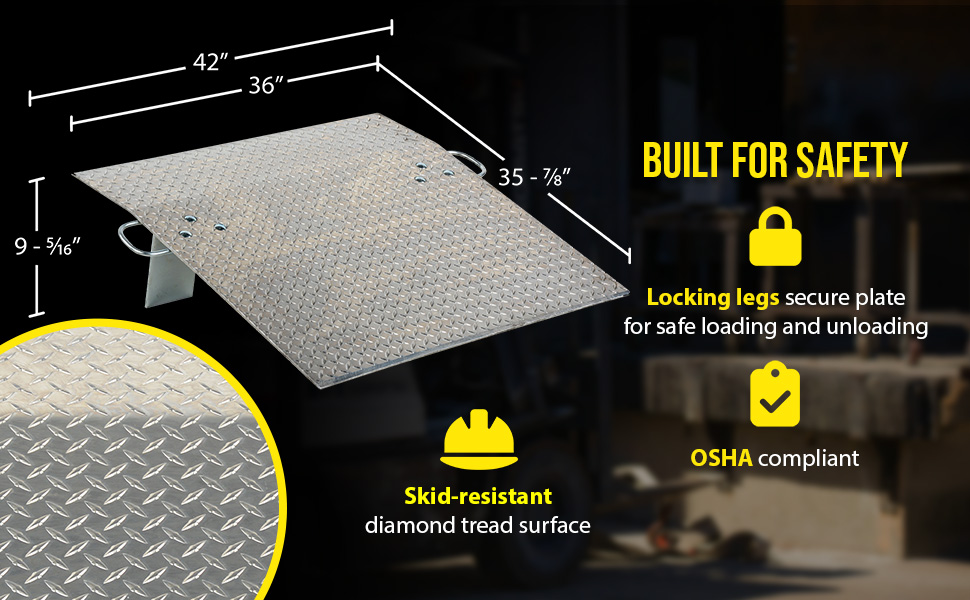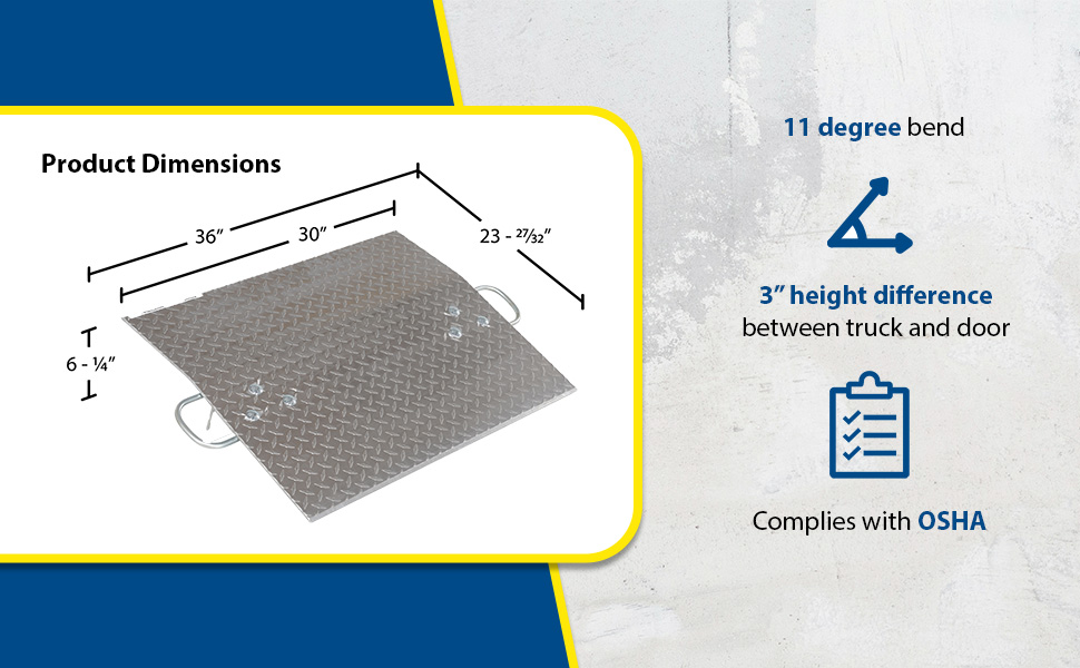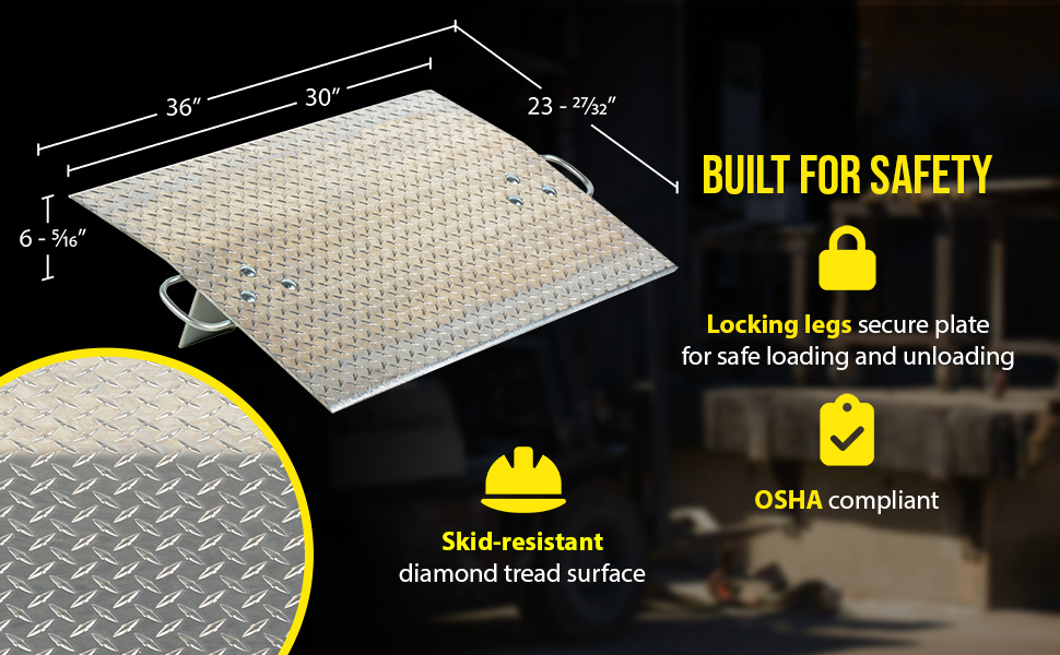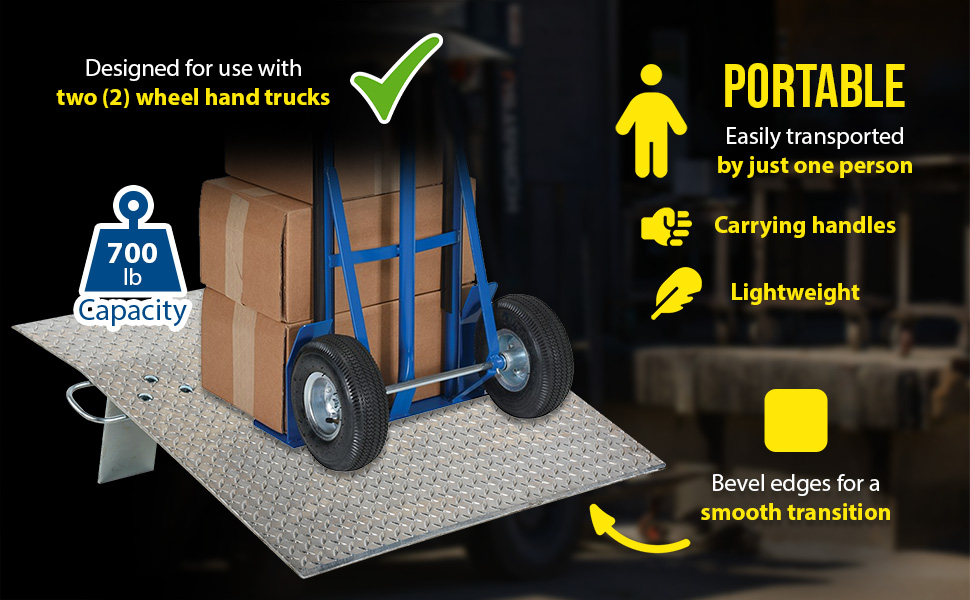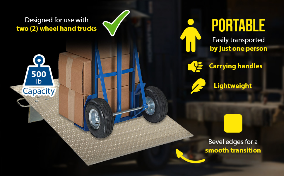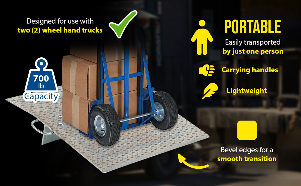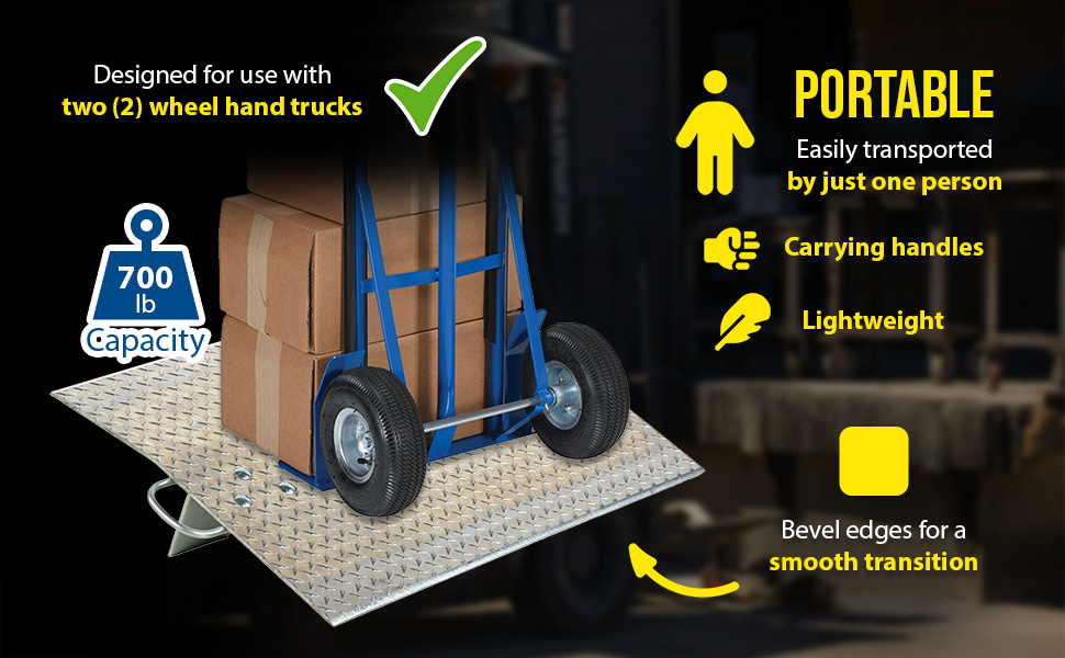Designed for use with two wheel hand trucks. A convenient, safe and easy way to access loading docks from trucks. Lightweight and easily portable by just one person. Treadplate surface ensures skid-resistant safe traction. Locking legs secure the plate for safe loading and unloading. Complete with bolt-on zinc plated carrying handles and locking legs. The bend or crown is 11 degrees and located 9" from edge of dockplate.