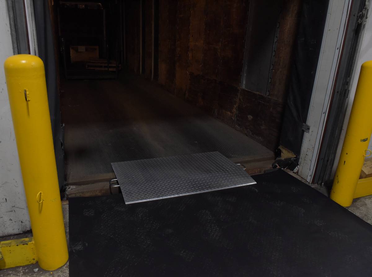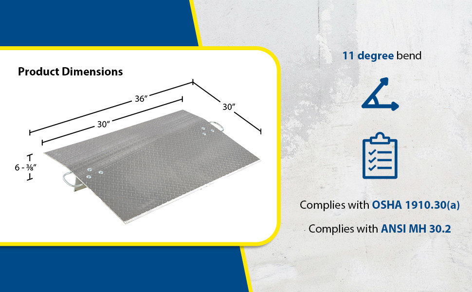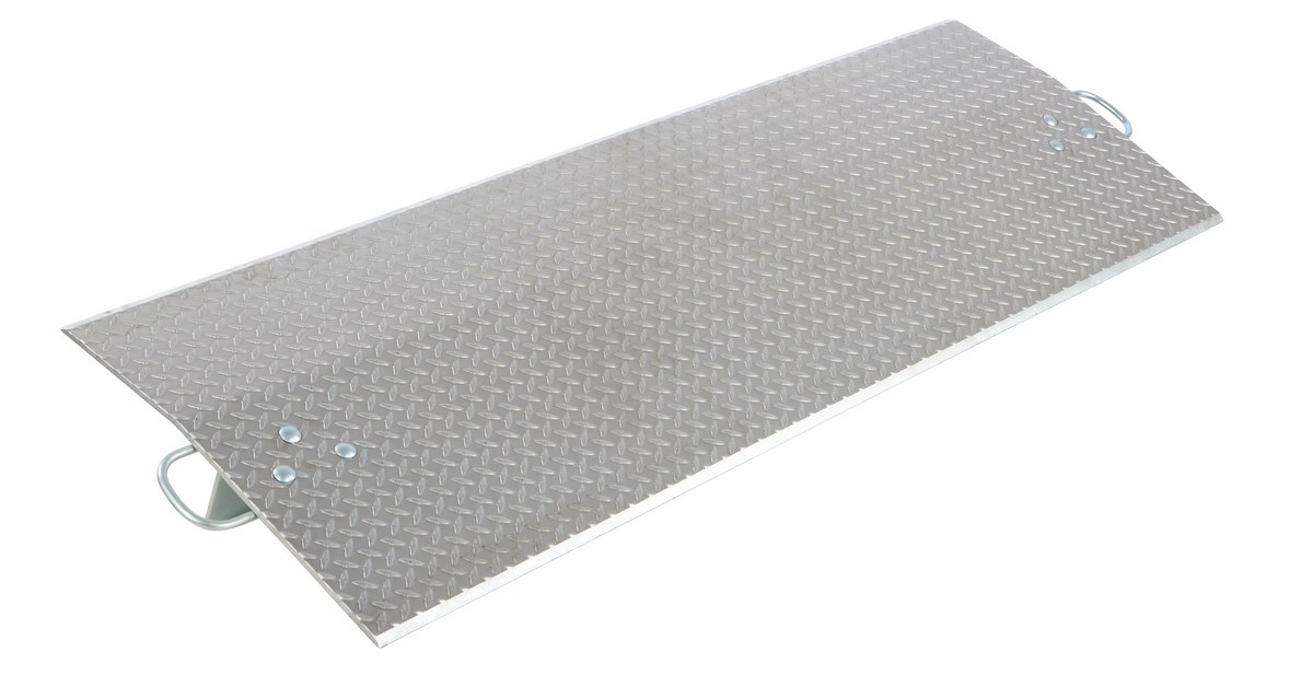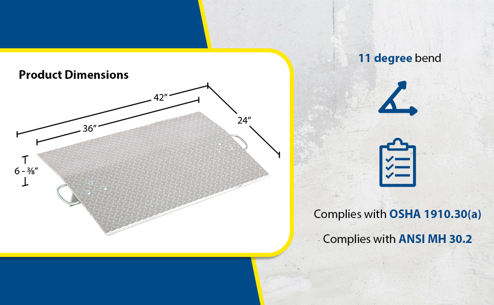 Aluminum Economizer Dockplates are an economical way to speed up truck loading and unloading. Spans the opening between the dock and trailer to allow pallet or hand trucks, along with pedestrian traffic to safely move in and out of the trailer. The dockplate is constructed of high strength, non-skid aluminum alloy tread plate. The lightweight design with bolt-on zinc plated legs and handles on each side makes portability easy. Locking legs for OSHA compliance. The bend or crown is 11 degrees and located 9" from edge of dockplate. Not for use with fork trucks.