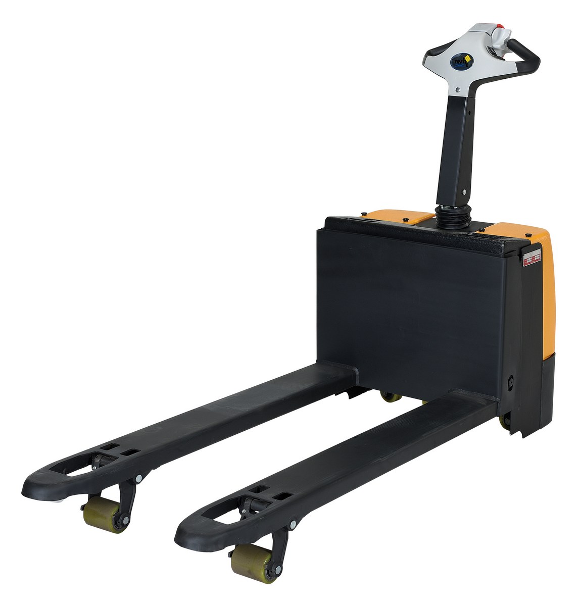 Fully Powered Electric Pallet Truck for easy and quick operation. Raise and lower loads with a push of a button. Maneuvers loads in warehouses and trailers. Reinforced welded forks with adjustable tie-rods give long service. High-torque 24V DC drive & lift motors handle heavy-duty jobs. Ergonomic handle features easy to operate throttle with infinite adjustment of forward and reverse speeds, lift/lower controls, proprietary safety-enhancing emergency reverse function, and horn. Includes an electromagnetic disc brake with automatic dead-man feature that activates when the user releases the handle.
