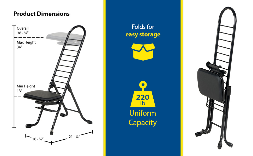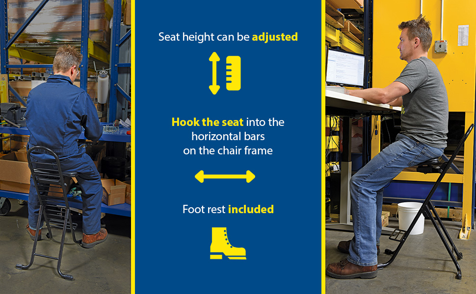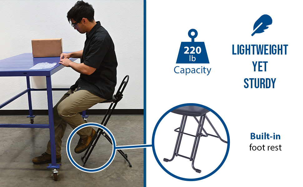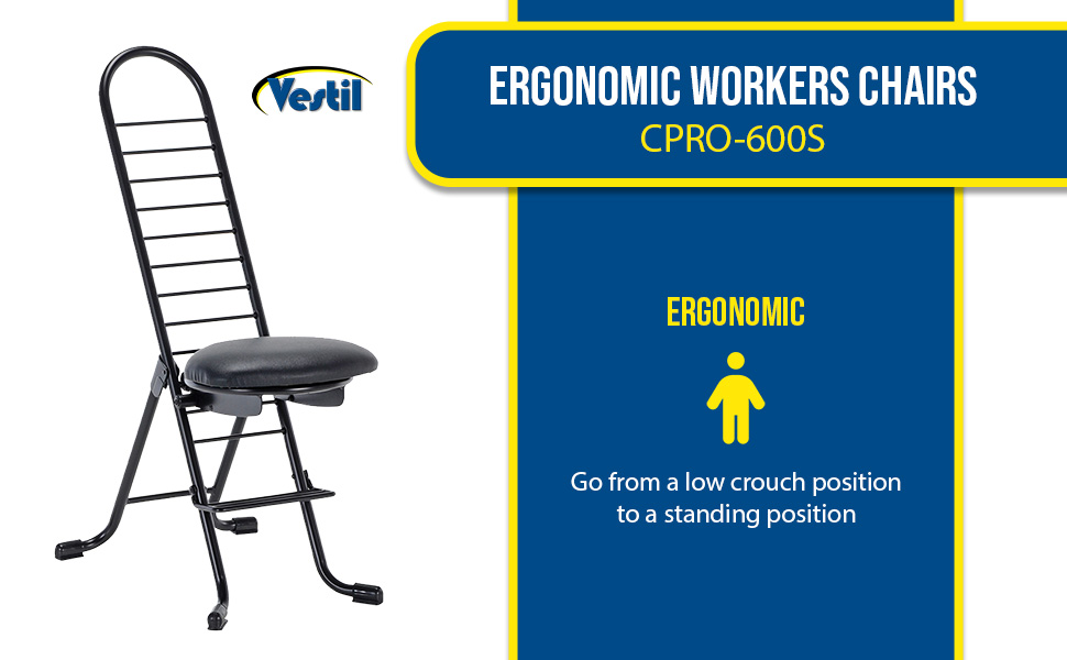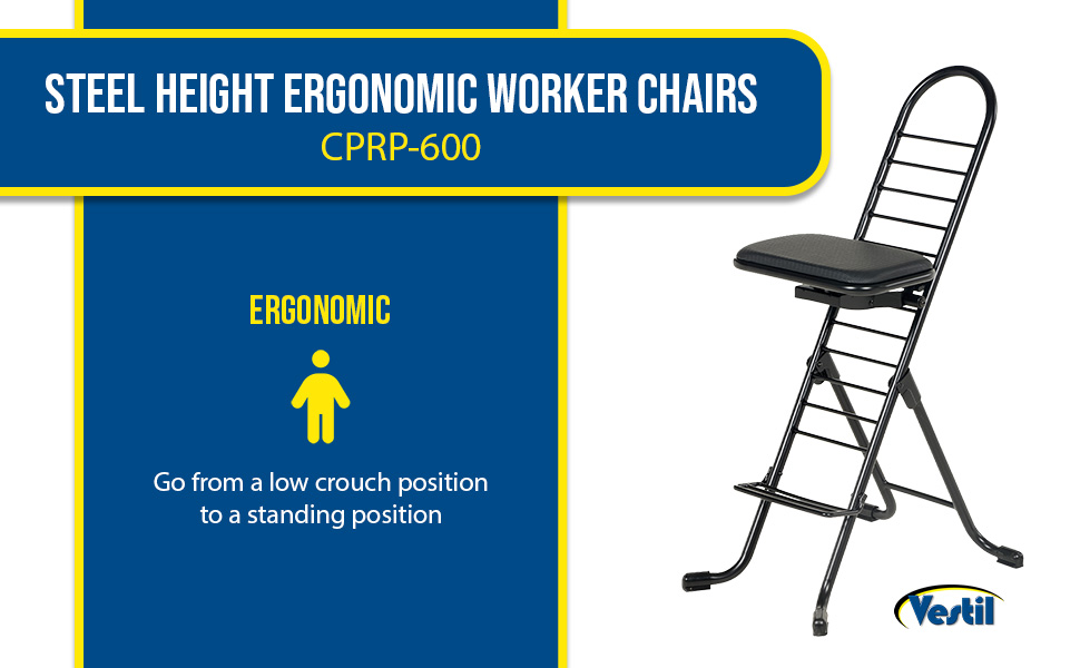 The CPRO-800LP model is not only convenient but easy to use. Simply unfold the rear legs and slide the contoured padded seat to the desired ergonomic height using the infinite adjustment for optimum work posture. Folds up to a 4" profile for easy portability and storage.