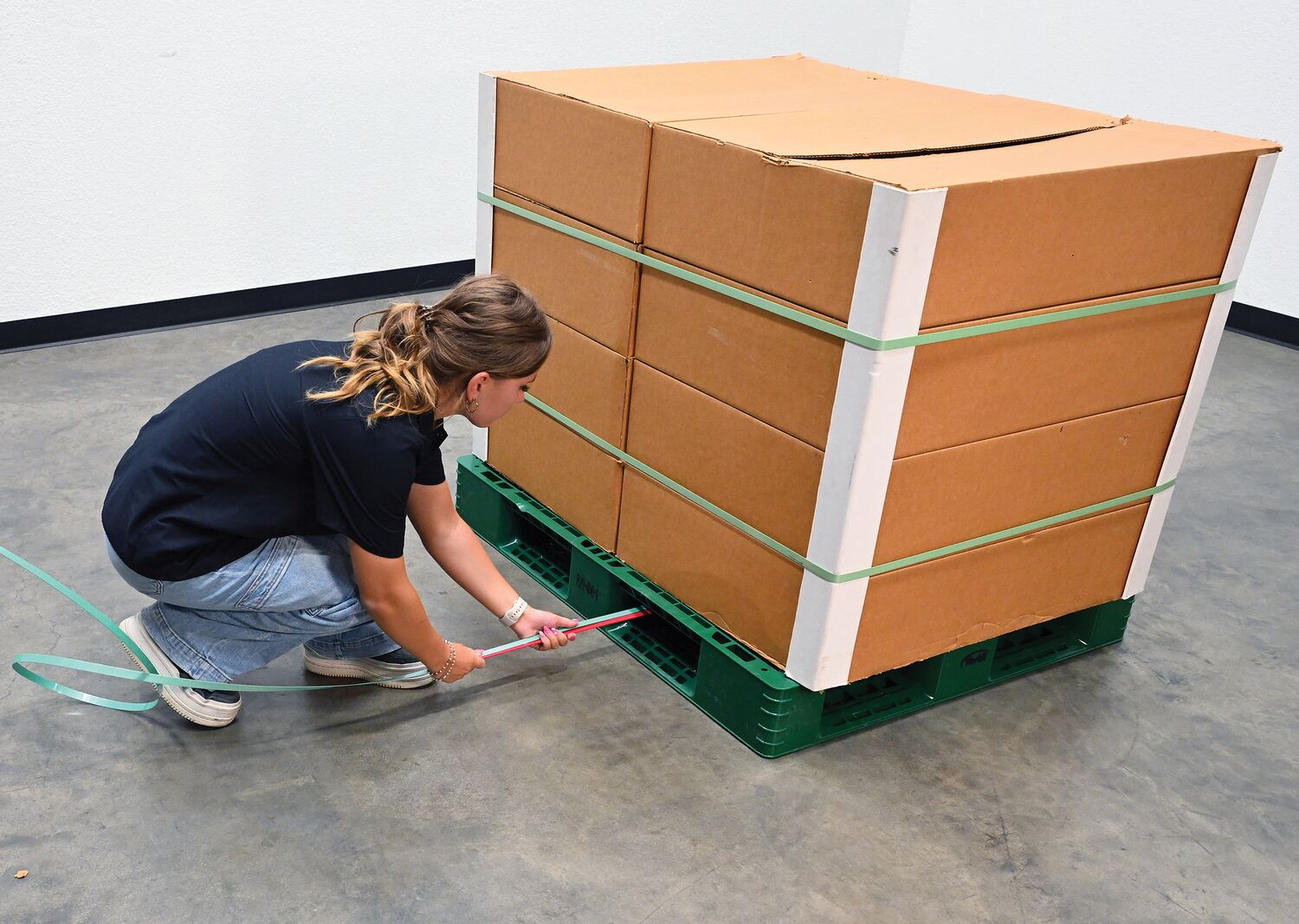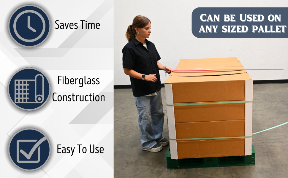 Allows for easy guidance of strapping through pallets. Decrease the time it takes to manually strap pallets. Flexible red fiberglass construction. Steel spring clip securely hold strapping.