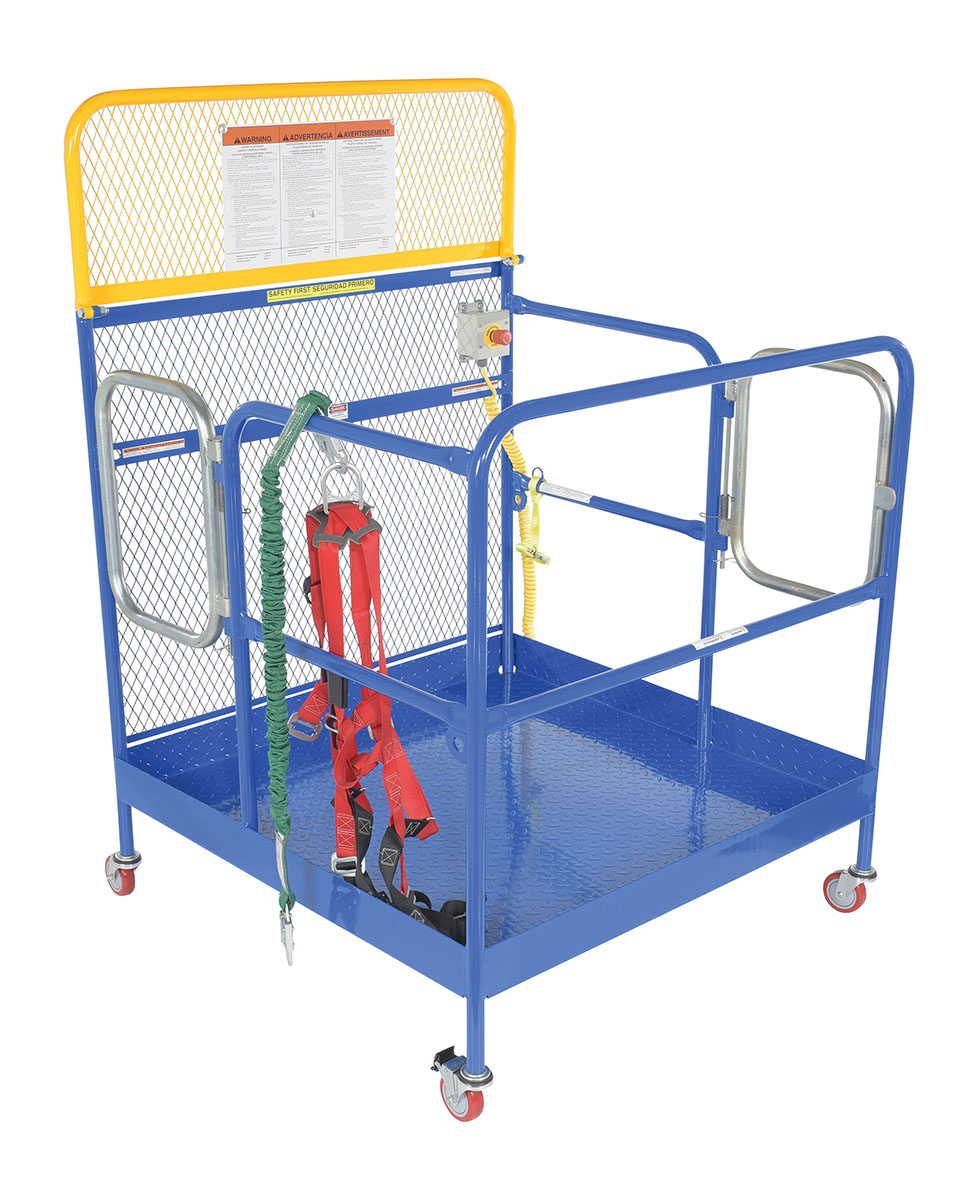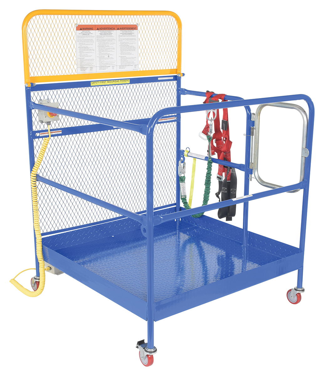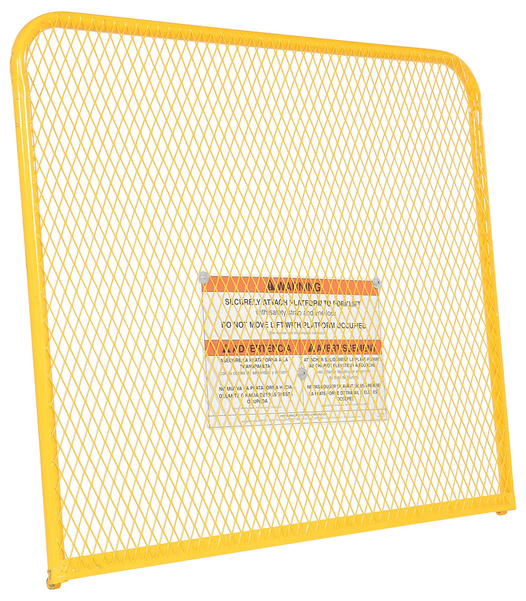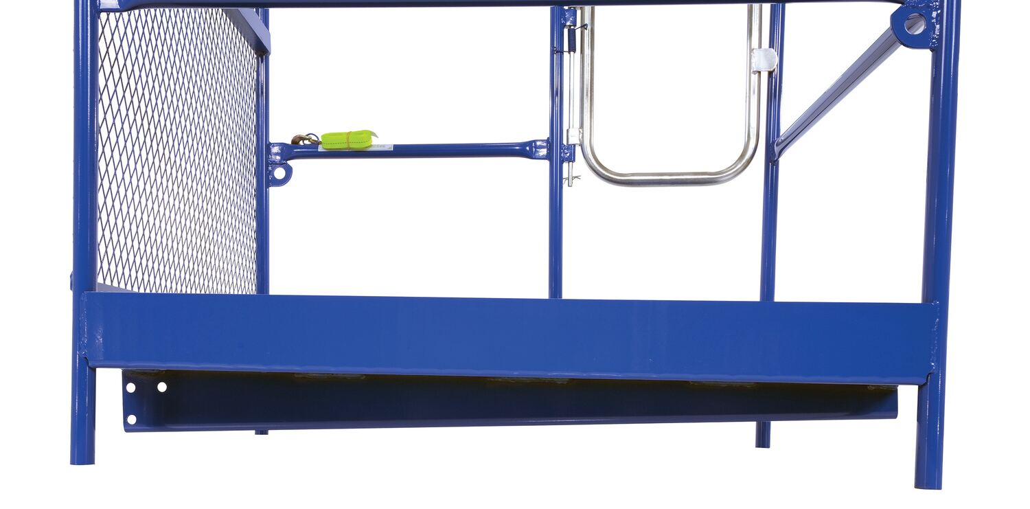 Each platform is built with key safety features including tine locks and a safety strap that secures the unit to the forktruck carriage. Select models include a spring-loaded self-closing door, while a yellow breakaway top section helps reduce risk from overhead contact.  Models with an -84B suffix meet California OSHA requirements with an 84” rear guard. Platforms are designed for use with a safety harness with lanyard (available under options) and include anchor points to hook them too.  Anchor point capacities: