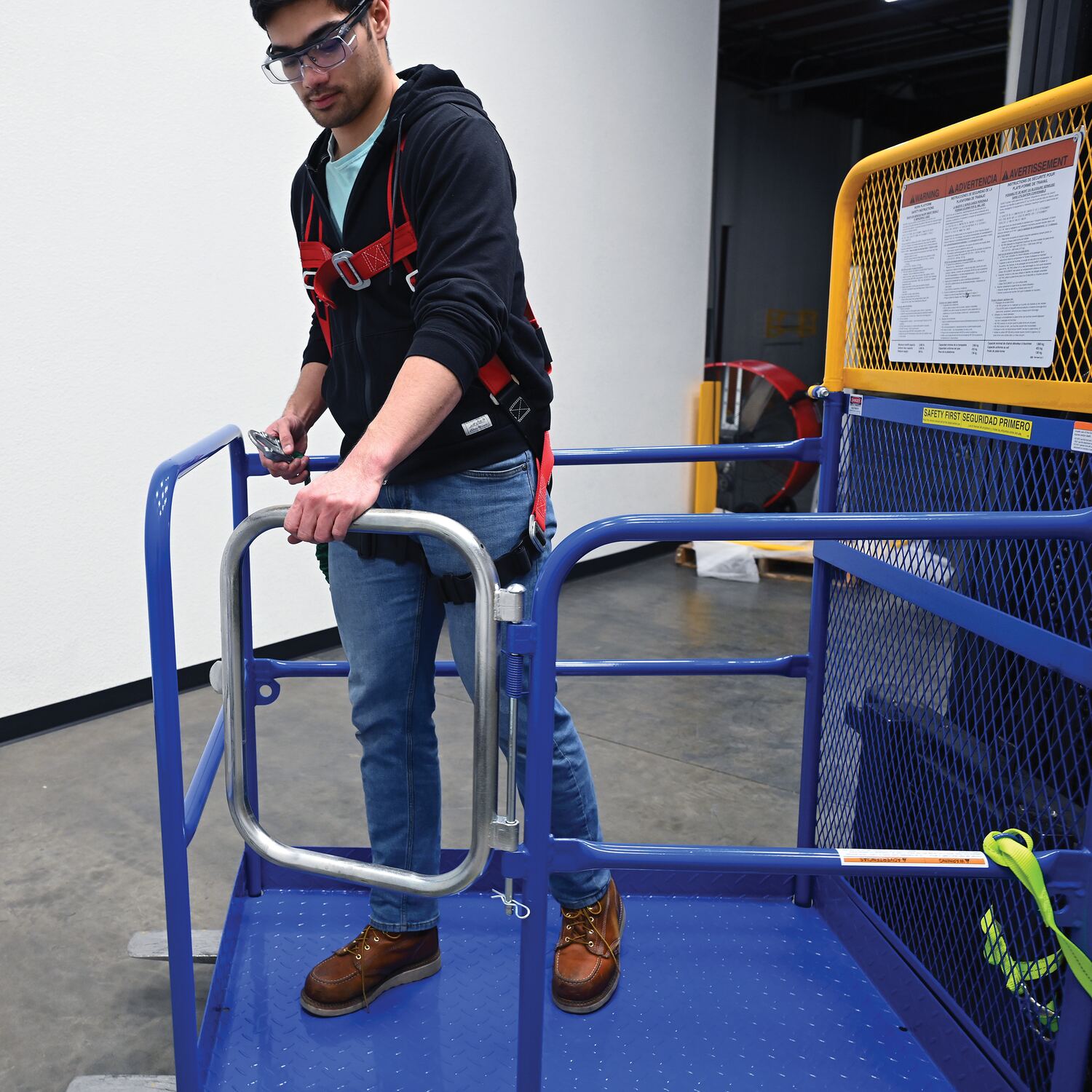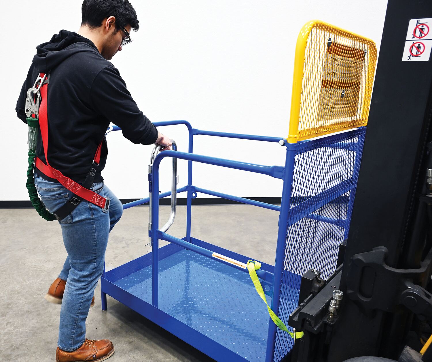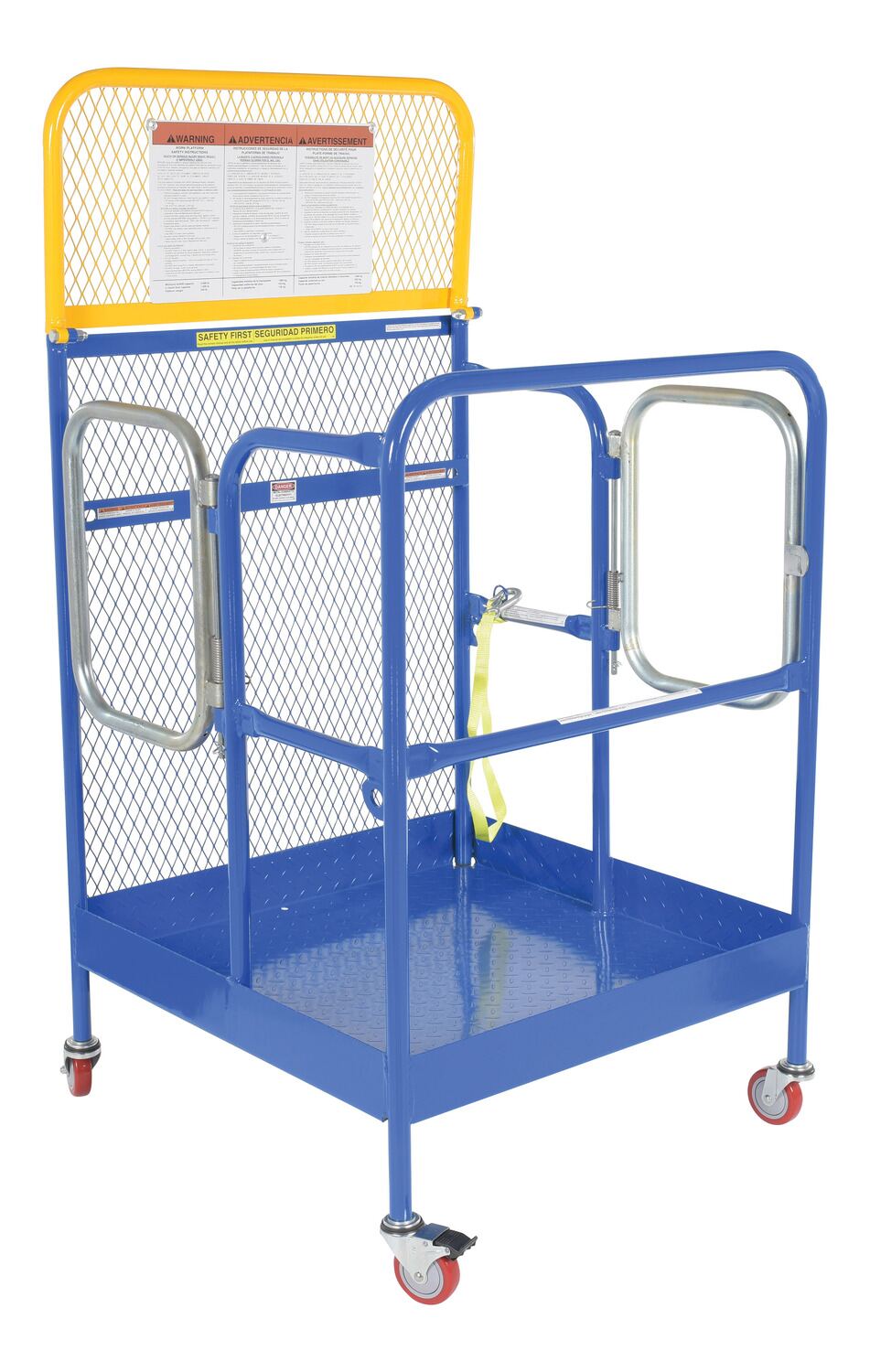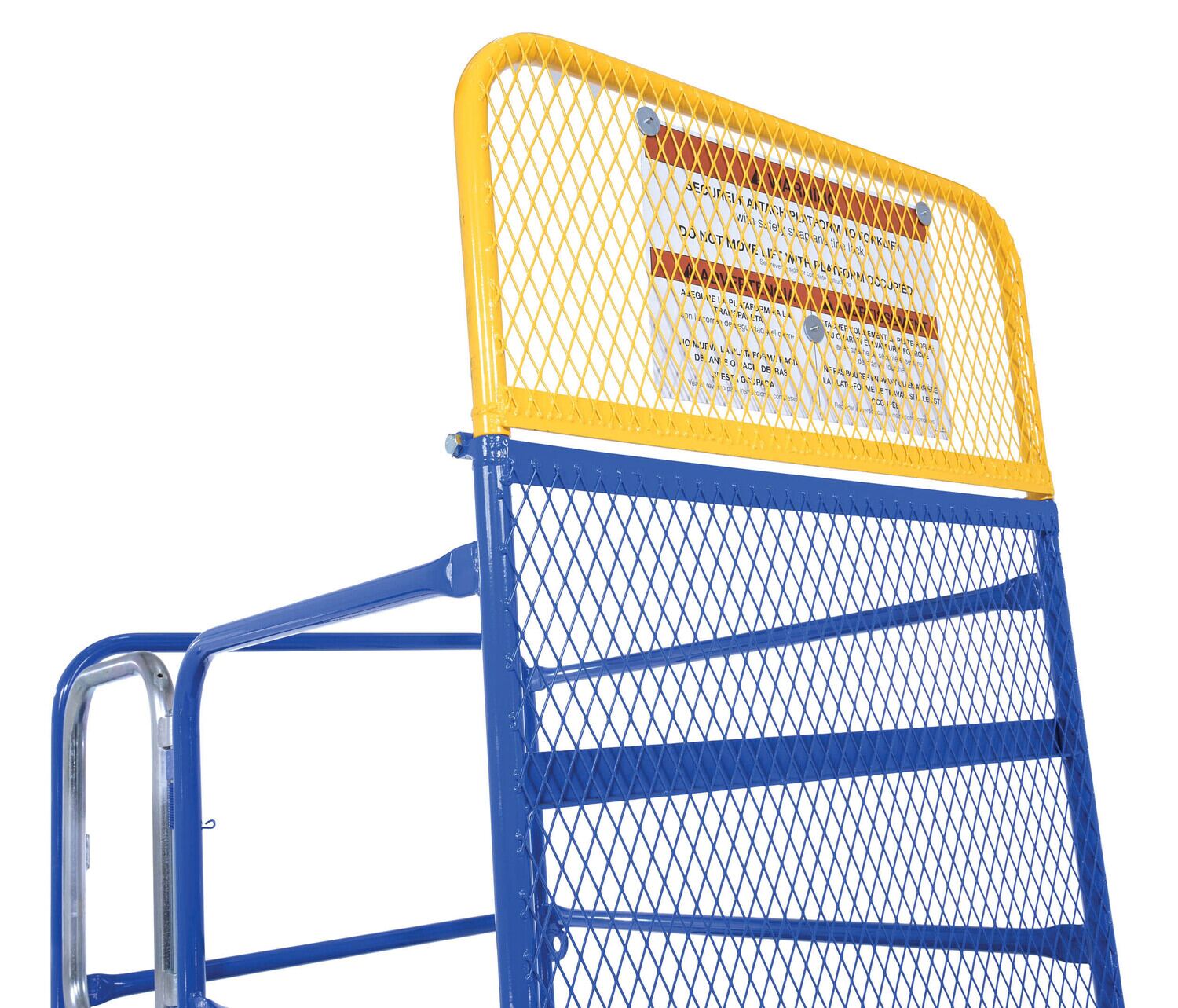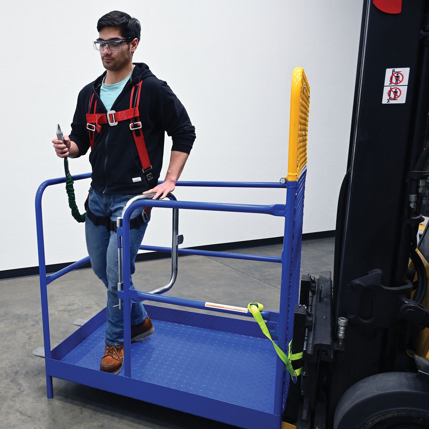 Each platform is built with key safety features including tine locks and a safety strap that secures the unit to the forktruck carriage. Select models include a spring-loaded self-closing door, while a yellow breakaway top section helps reduce risk from overhead contact.  Models with an -84B suffix meet California OSHA requirements with an 84” rear guard. Platforms are designed for use with a safety harness with lanyard (available under options) and include anchor points to hook them too.  Anchor point capacities: