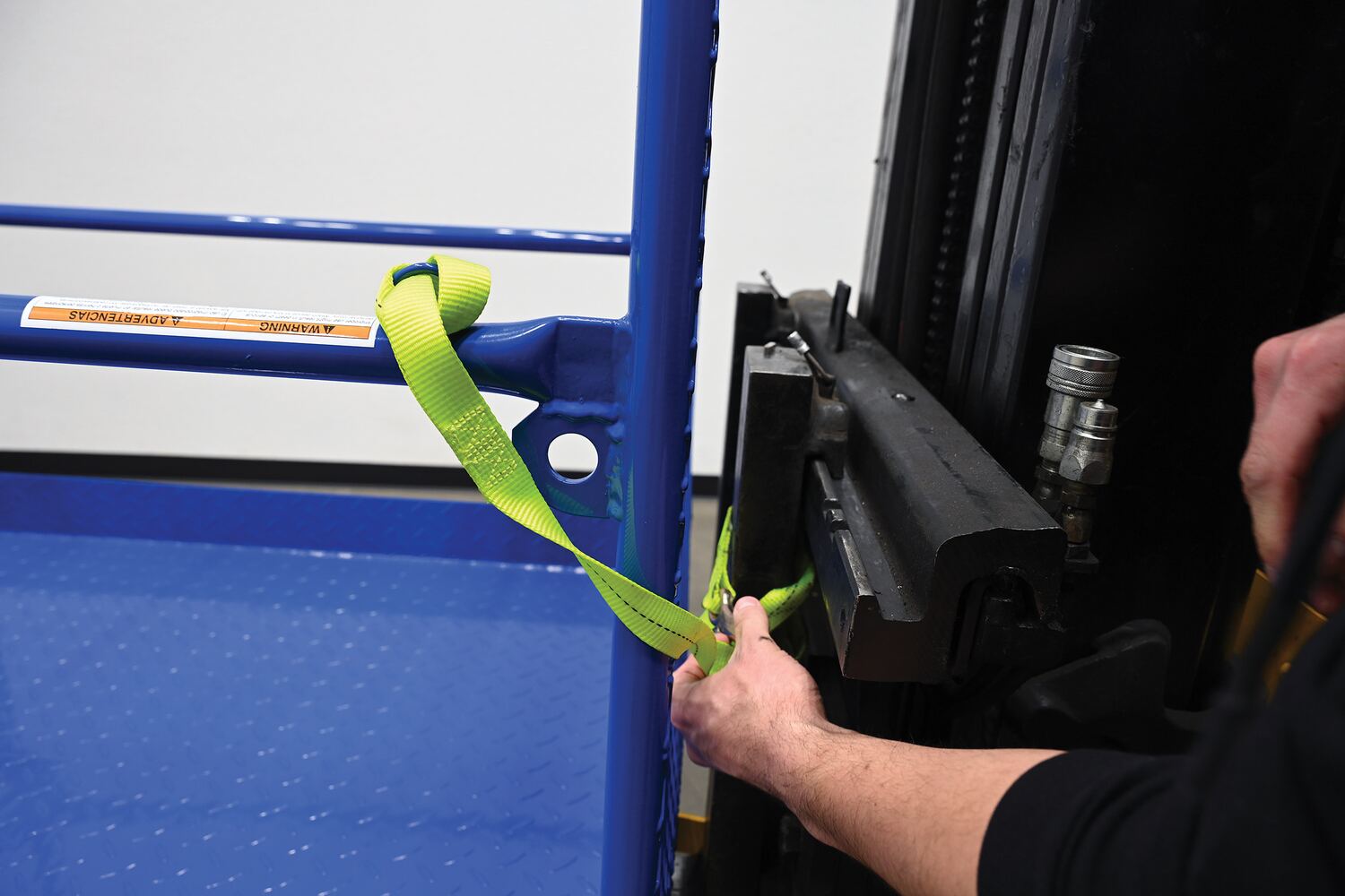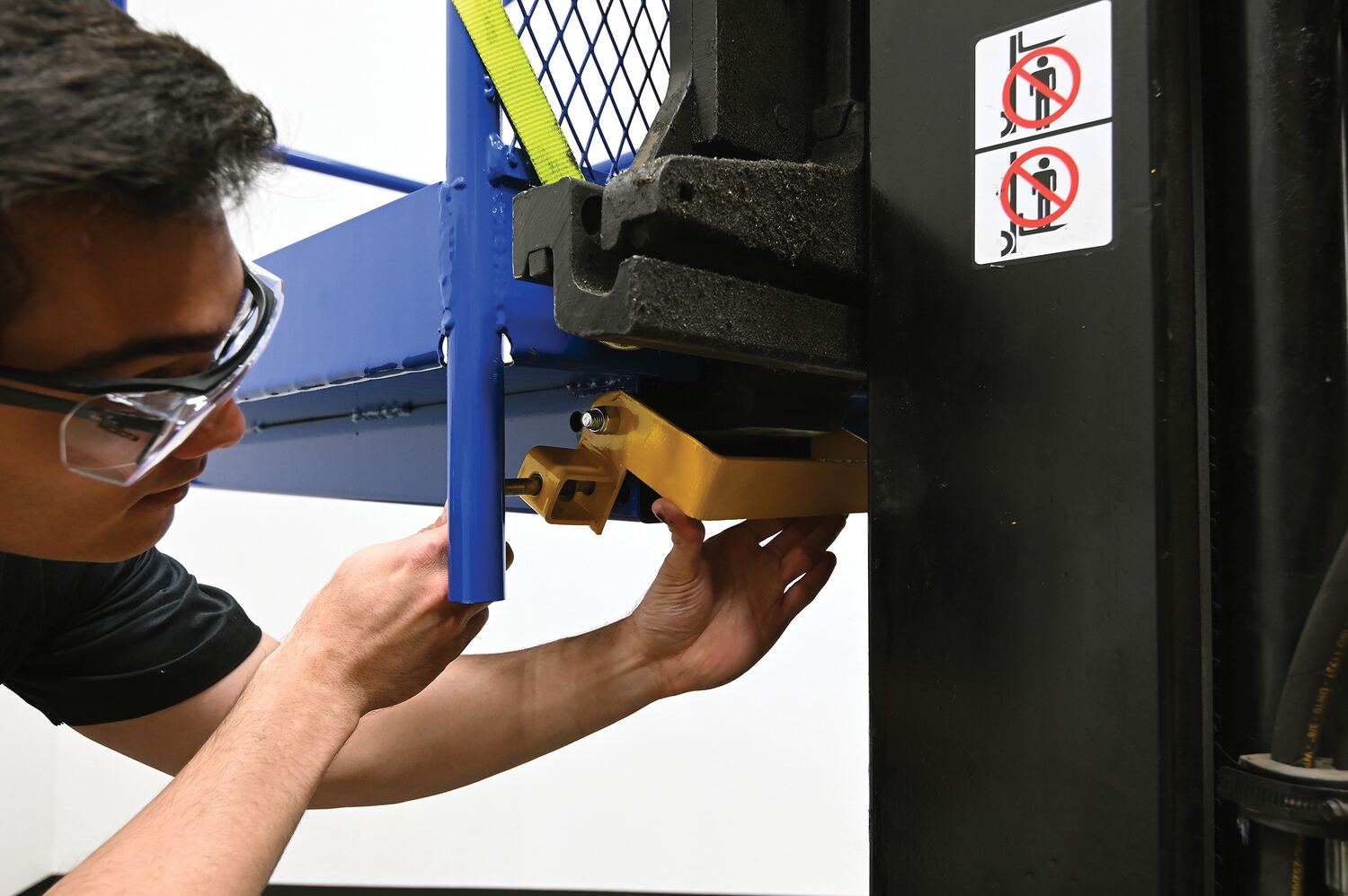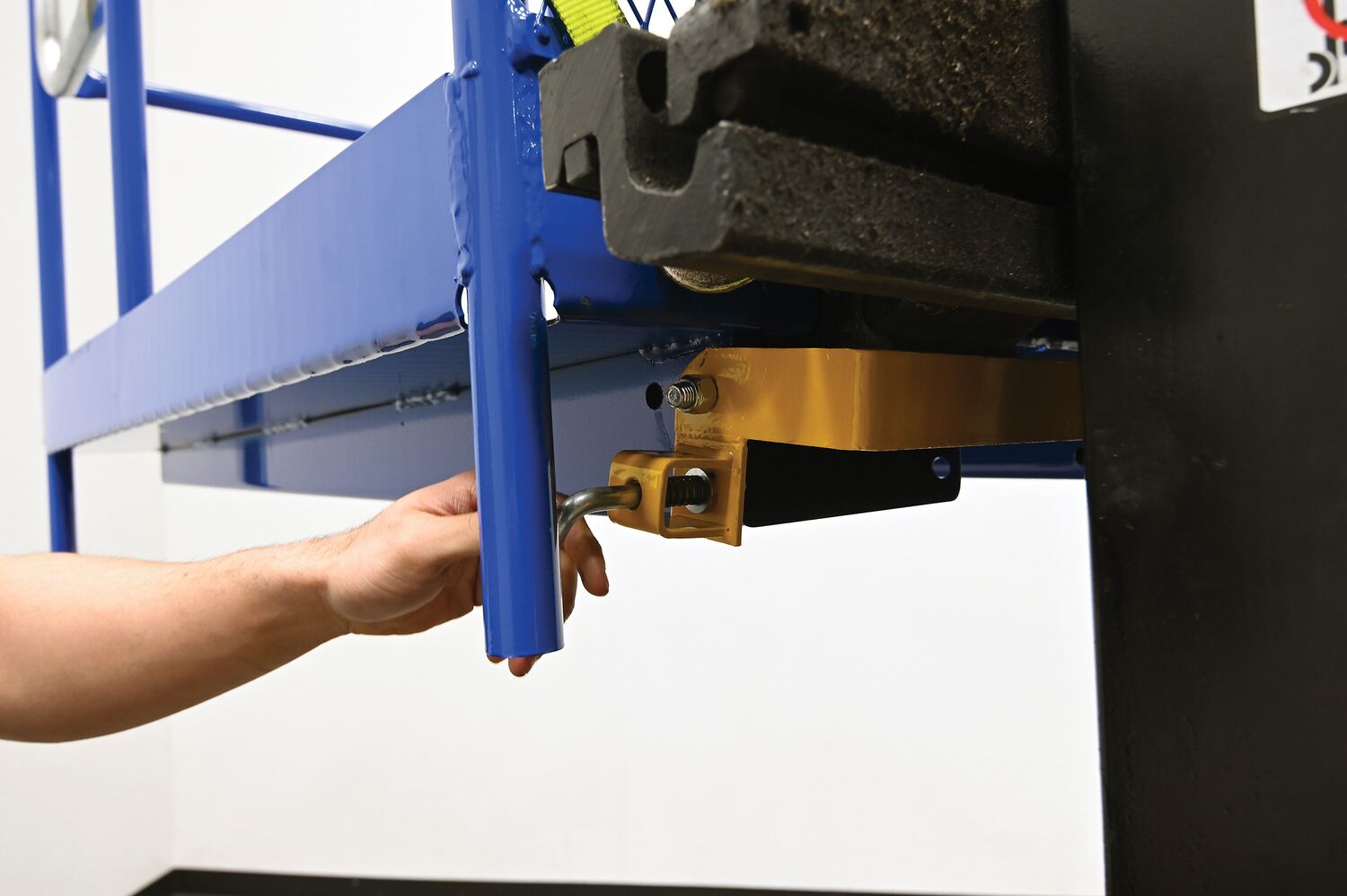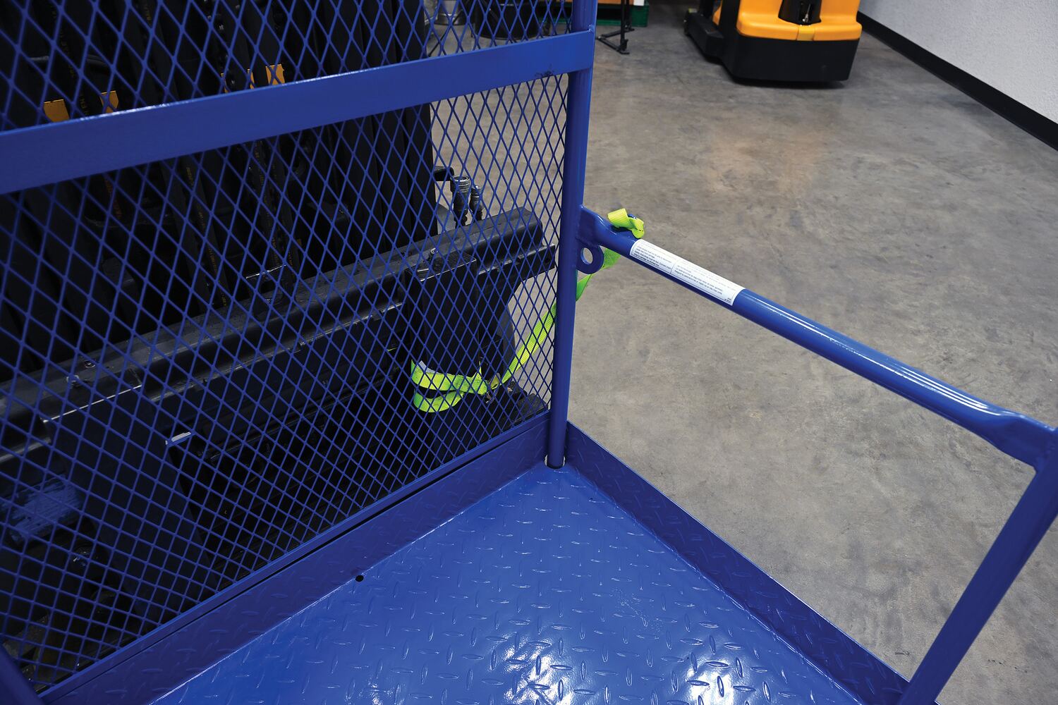 Each platform is built with key safety features including tine locks and a safety strap that secures the unit to the forktruck carriage. Select models include a spring-loaded self-closing door, while a yellow breakaway top section helps reduce risk from overhead contact.  Models with an -84B suffix meet California OSHA requirements with an 84” rear guard. Platforms are designed for use with a safety harness with lanyard (available under options) and include anchor points to hook them too.  Anchor point capacities: