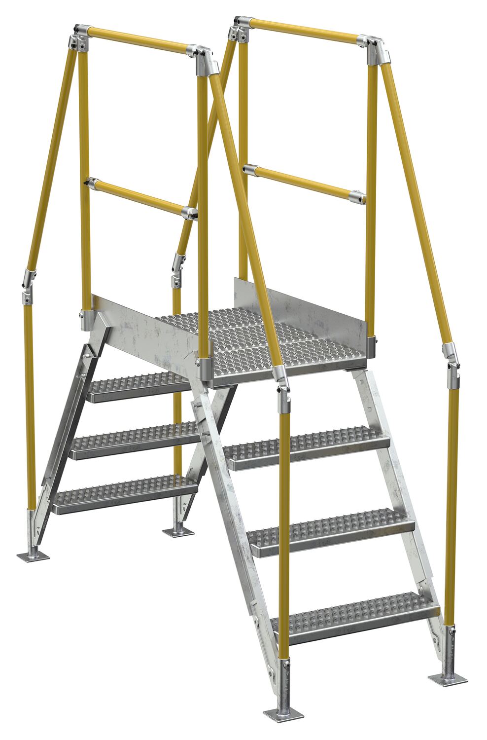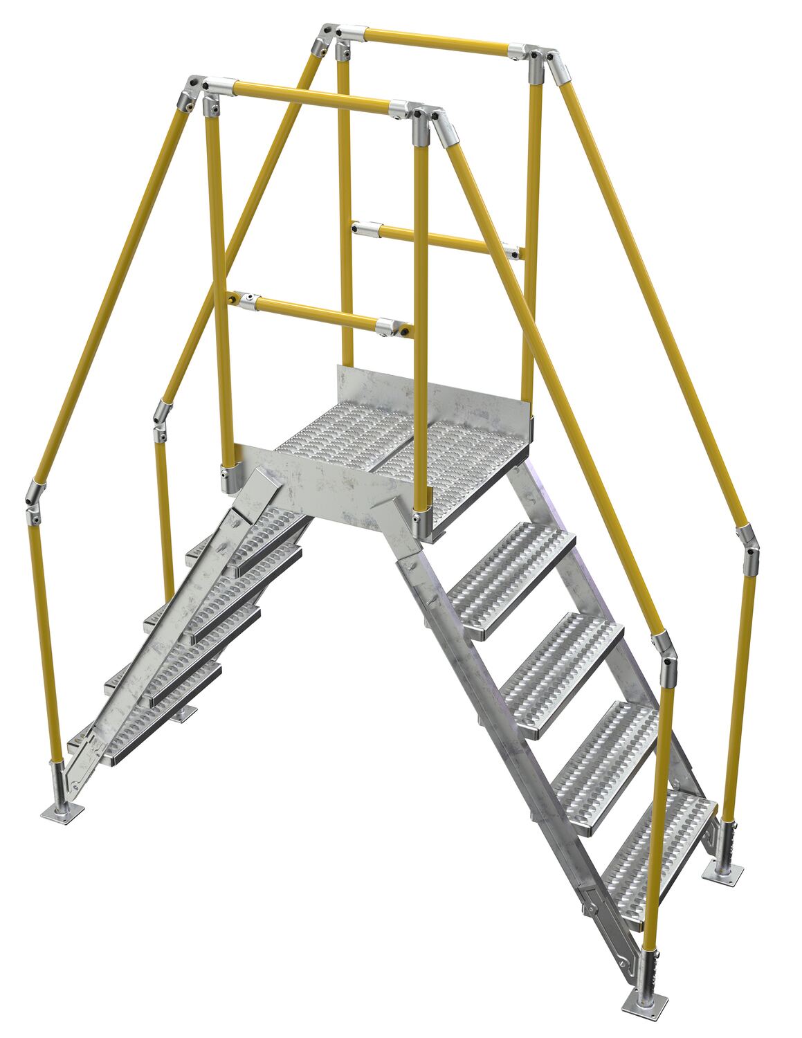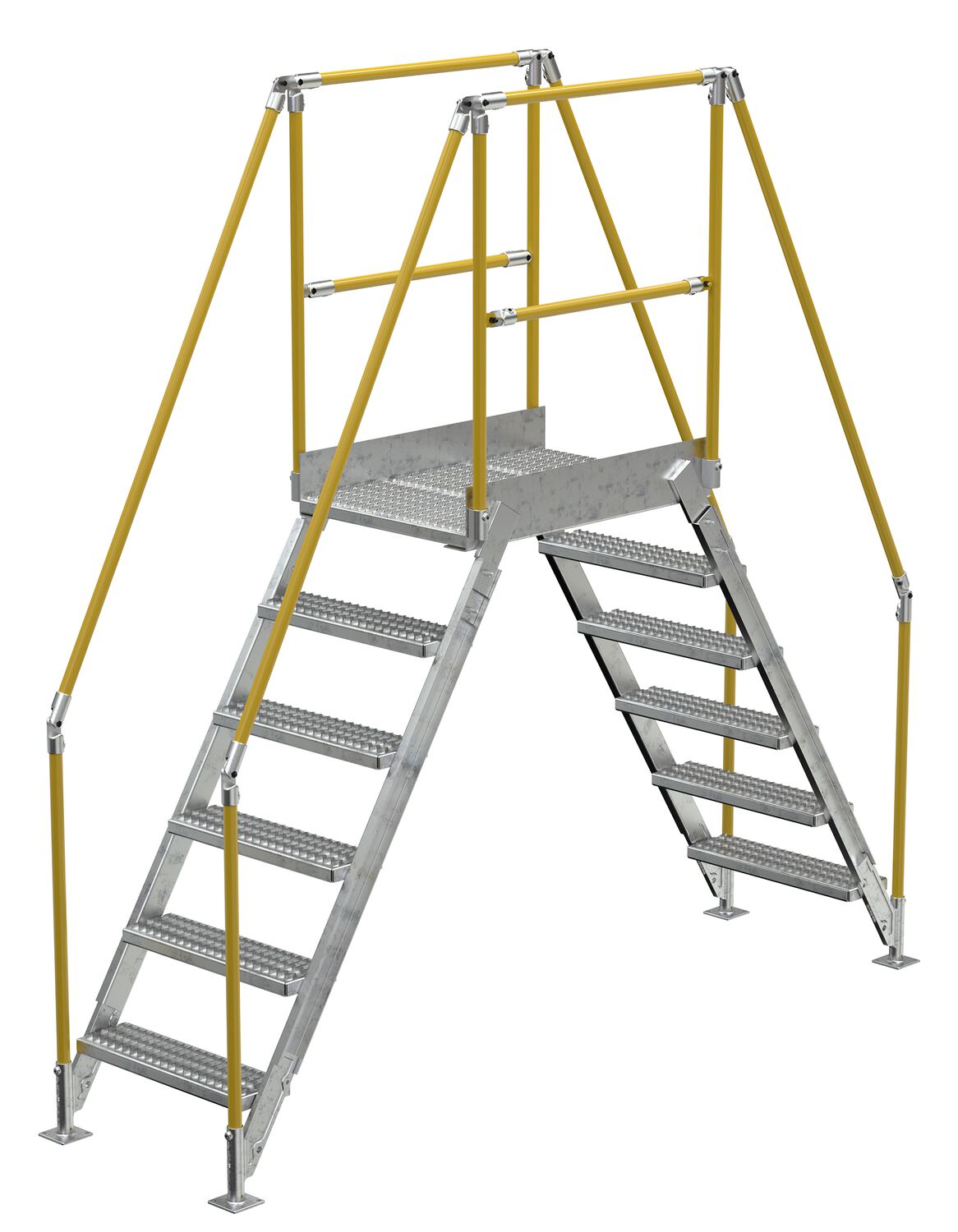 In crowded industrial settings, sometimes the best way around an obstruction is up and over. Utilizing a crossover ladder allows the permanent pieces in the work area to stay in place, while providing a more efficient option for personnel. The horizontal platform includes both upper and lower rails for complete staff security. Ground legs include floor mounting pads and units must be anchored to the surface. During times of temporary use, the ladder can be uninstalled and 'knocked-down' for storage and shipping. Handrails have a safety yellow powder coat finish. Steps and platform have a durable hot dip galvanize finish.