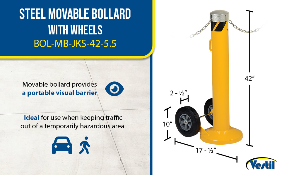BOL-MB-JK-42-5.5 BOL-MB-JK-42-5.5Steel Movable Bollard with Wheels, Removable Plastic Cap and Slots 42 In. x 5-1/2 In. YellowBollard Thickness (in.): 1/8