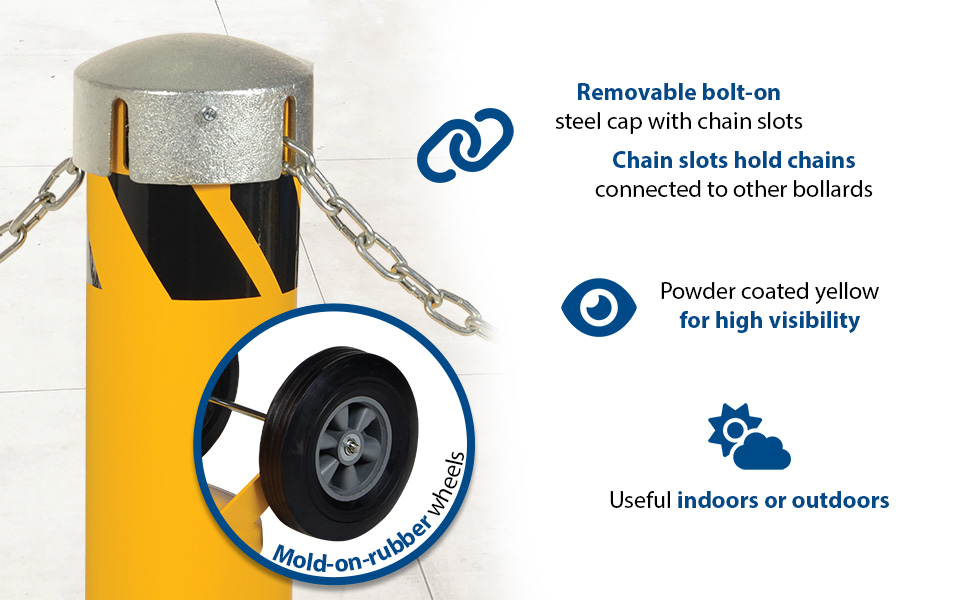 Movable Bollards provide a portable visual barrier when an area needs temporary protection. Ideal for use when keeping traffic out of a temporarily hazardous area or area under repair. Can be used indoors or outdoors. Units are 42" high with a diameter of 5-1/2". 10" moldon-rubber wheels standard. Yellow baked-in powder-coated toughness for high visibility. Series BOL-MB-JK has a removable plastic top cap, which exposes four chain slots. Series BOL-MB-JKS has a removable bolt-on steel top cap with socket set-screw.