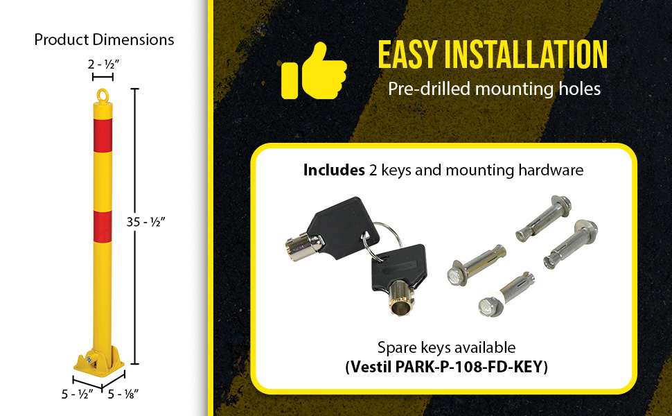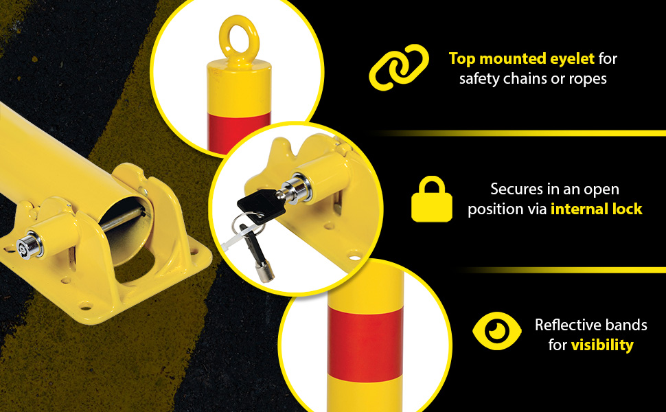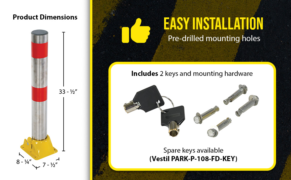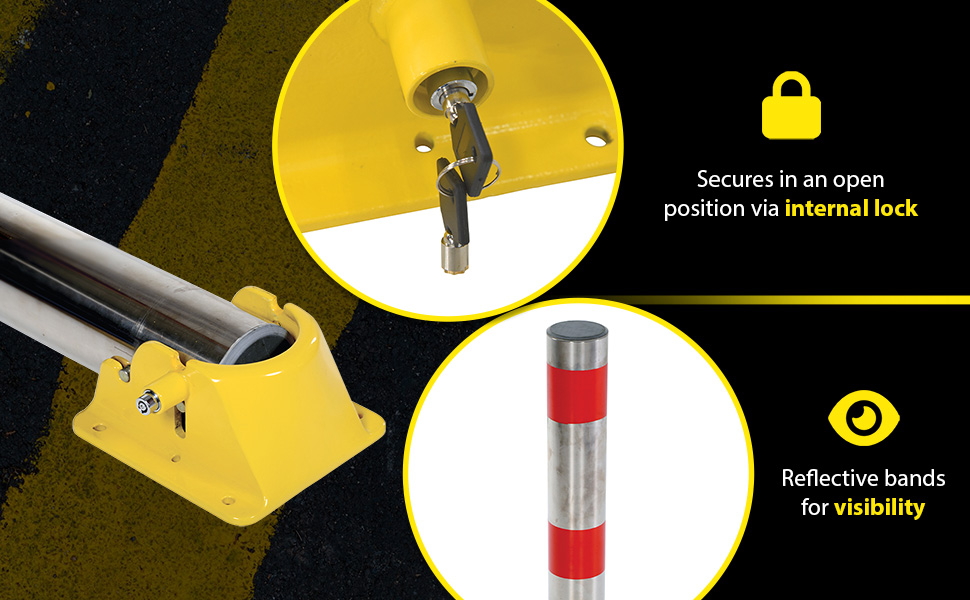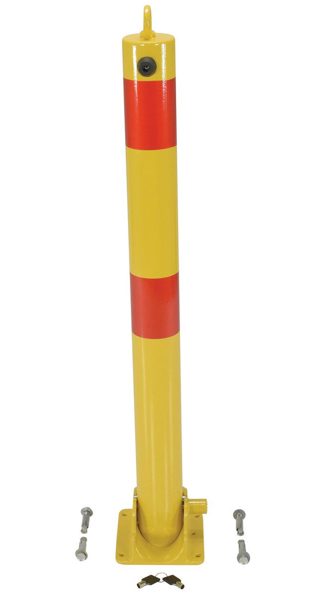 Ideal for vehicle access control. These heavy duty bollards feature integrated locking and an easy to operate cam-lock. Unit secures in open position via internal lock. Two (2) keys included. Four (4) 3/8" x 3" concrete anchors included for securing bollard to concrete.