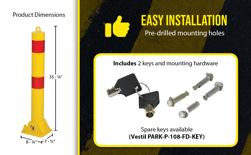 PARK-P-108-FD PARK-P-108-FDSteel Fold Down Bollard 8-1/4 In. x 7-1/2 In. x 35-1/2 In. YellowFold Down Height (in.): 5