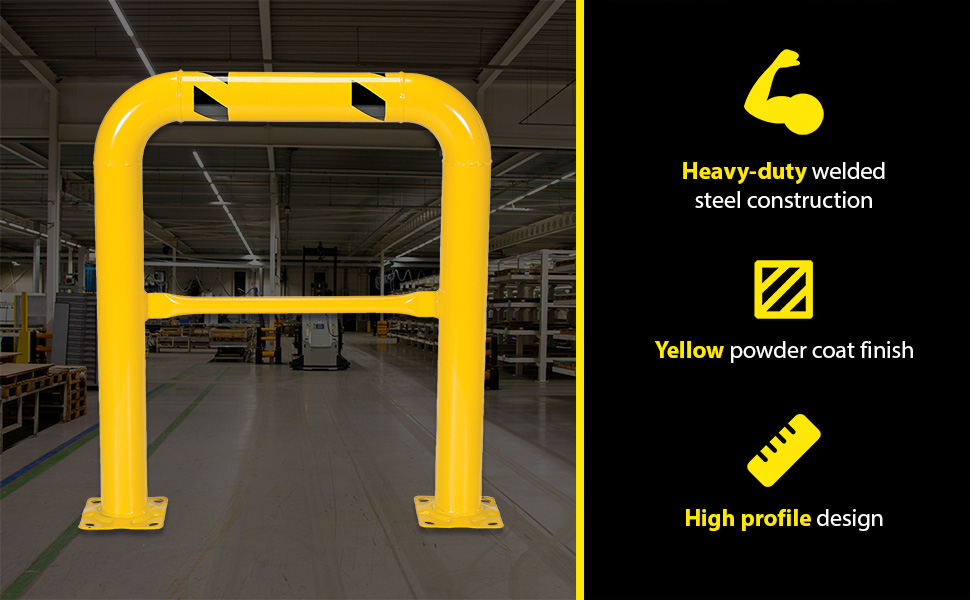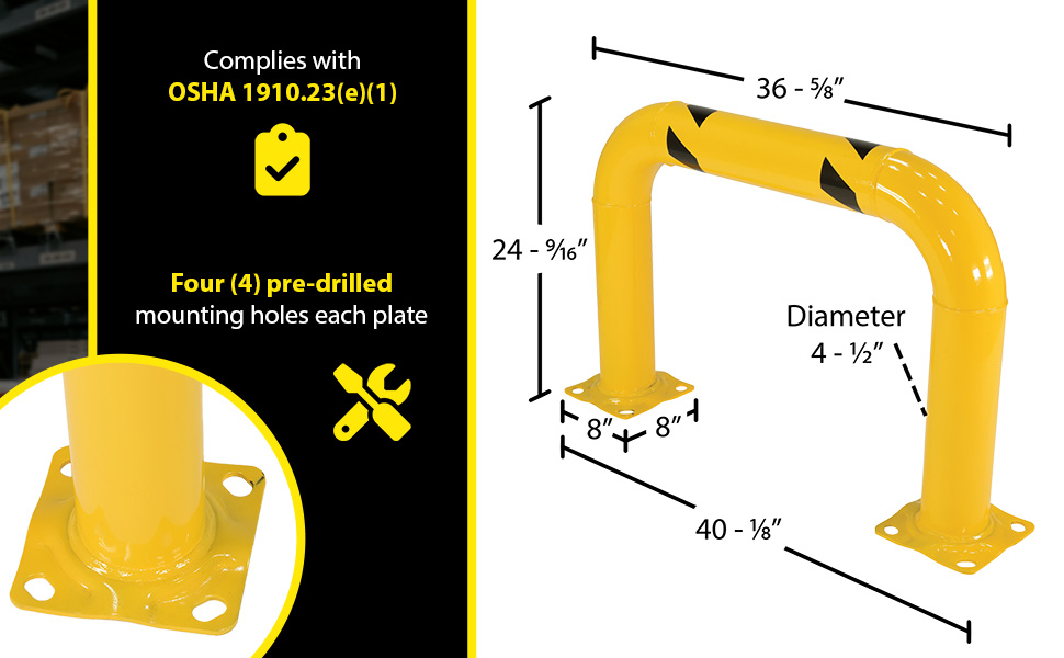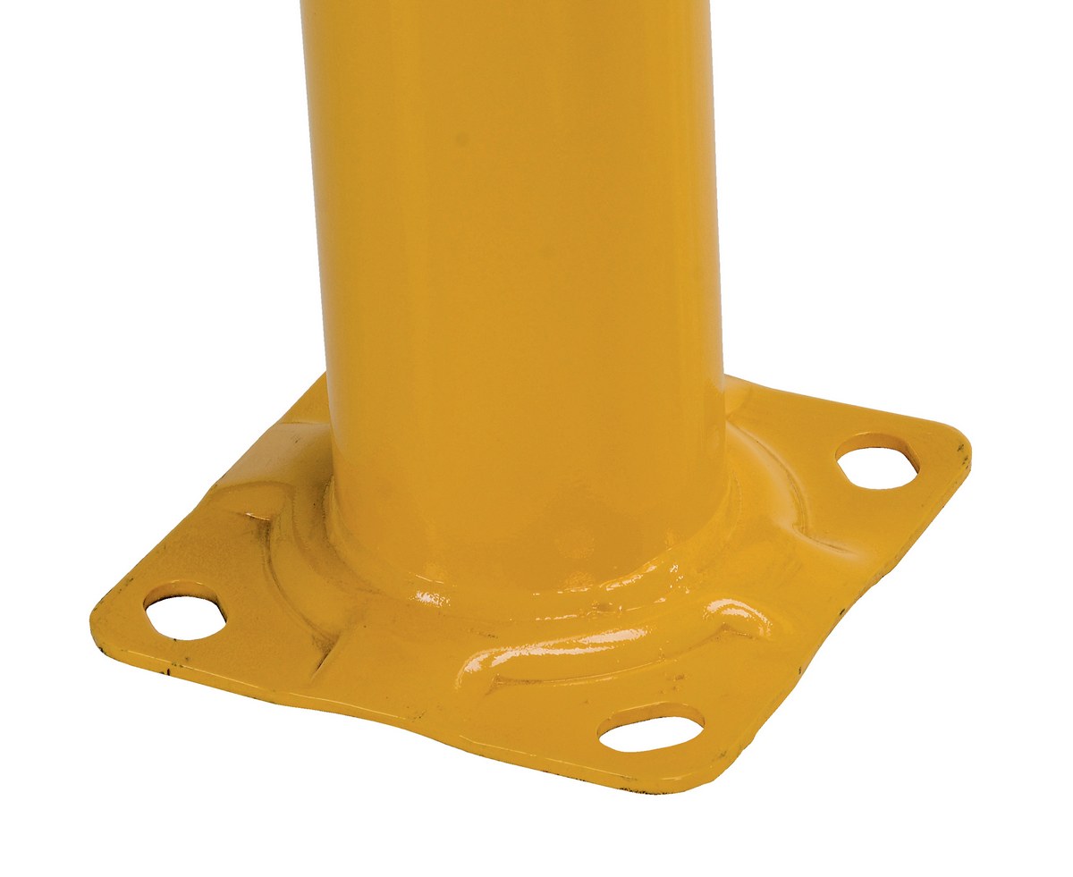 Heavy-duty welded steel construction for protecting racks, building walls, expensive equipment, and hundreds of other applications. All 42" high units include a 21" mid-rail to comply with OSHA requirements. Available with a baked-in yellow powder coated finish for toughness. A 304 stainless steel polished finish is also available. Two base plates with four pre-drilled mounting holes in each plate.