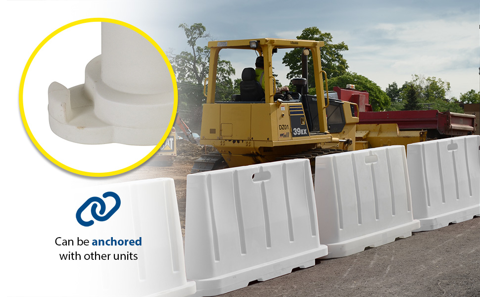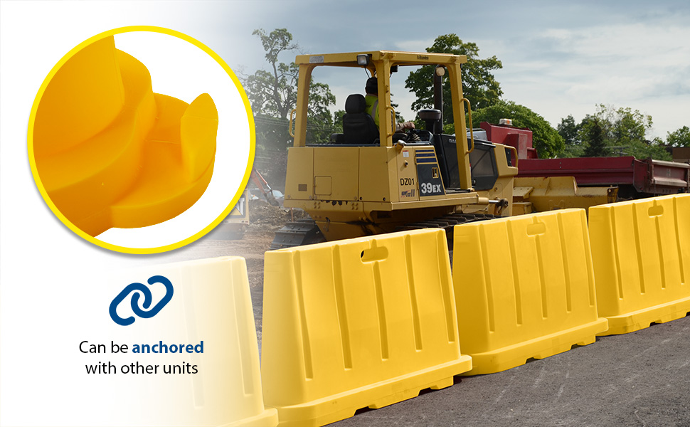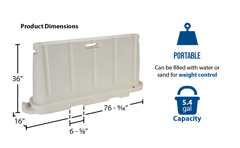 Uses 80% less storage space! Common uses include: Crowd & traffic control, area delineation, security, pedestrian protection, construction worker protection, restrict access to areas, factory & warehouse settings. Standard Features: Material thickness is 0.150" Empty weight is 37 Lb. Colors are consistent with ANSI Z535.1 safety colors Manufactured of virgin polyethylene material with UV stabilizer Overall size is 76-1/2"L X 16"W x 36"H (Effective connected length is 72") Hollow base may be filled with 5.4 gallons of water for added weight (~45 Lb.) Not for highway use.