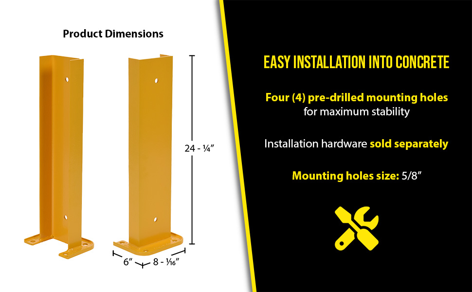 Economical way to protect against damage to pallet racking and wall corners. Constructed of 6" or 8" steel "C" channel for durability. Available with or without a rubber bumper. Easy to install to concrete surface. Four mounting holes for maximum stability. Safety yellow Baked-in powder-coated toughness. Models G6 require 1/2" anchor bolts. Models G8 require 3/4" anchor bolts. Installation hardware sold separately.
