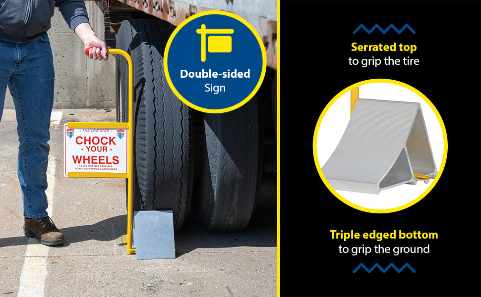 Constructed of extruded lightweight aluminum that is easy to handle. Features a serrated top to grip the tire and a triple edged bottom to grip the ground. Optional handle and sign attachment available. Customer signs available.