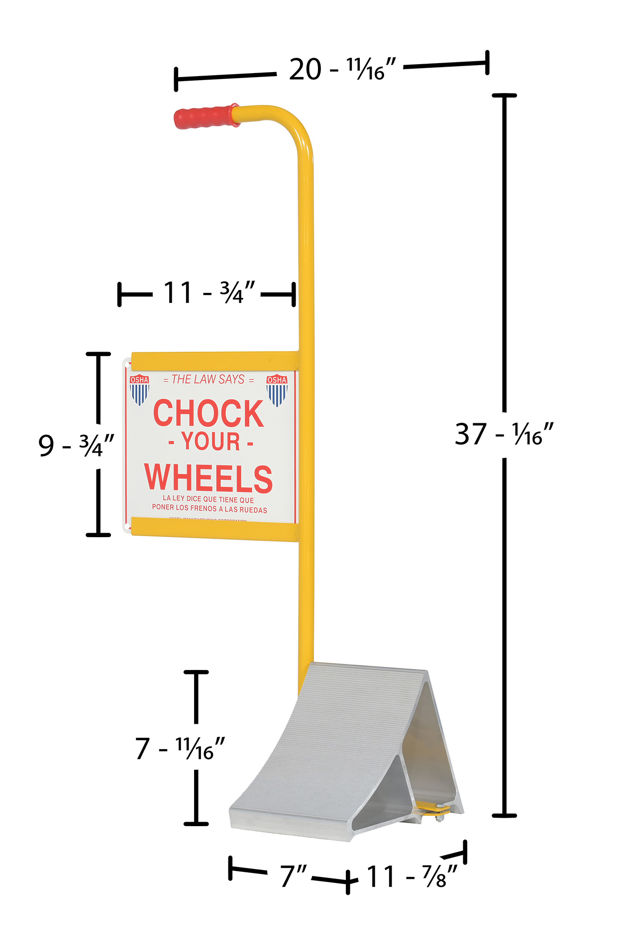 EALUM-7-HS EALUM-7-HSAluminum Wheel Chock with Handle and Sign 7-11/16 In. x 20-11/16 In. x 37-1/16 In. Silver/YellowUsable Chock Width (in.): 7