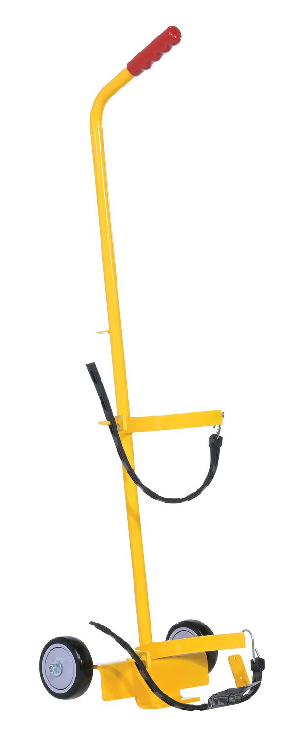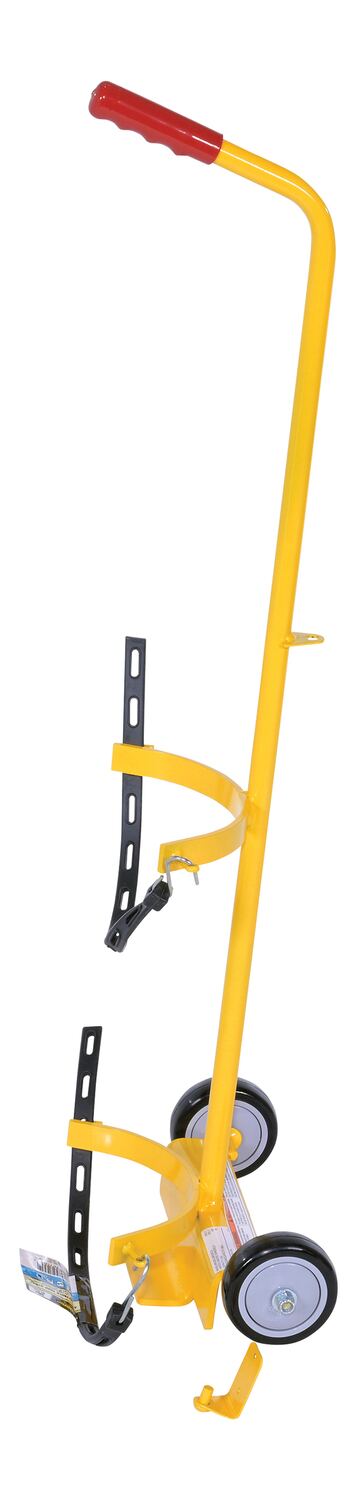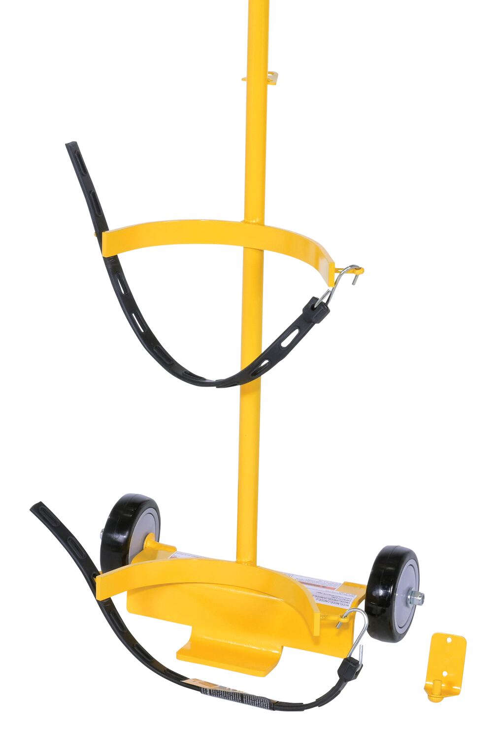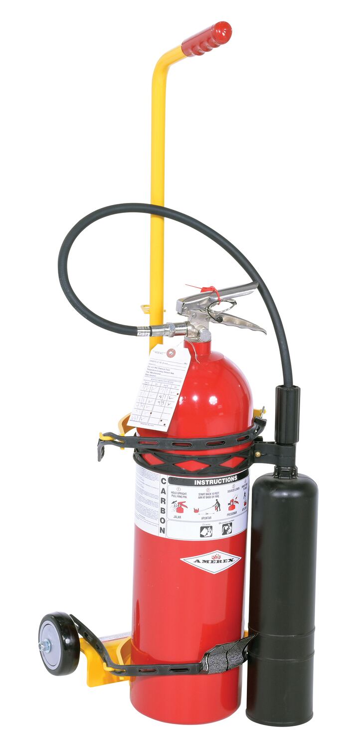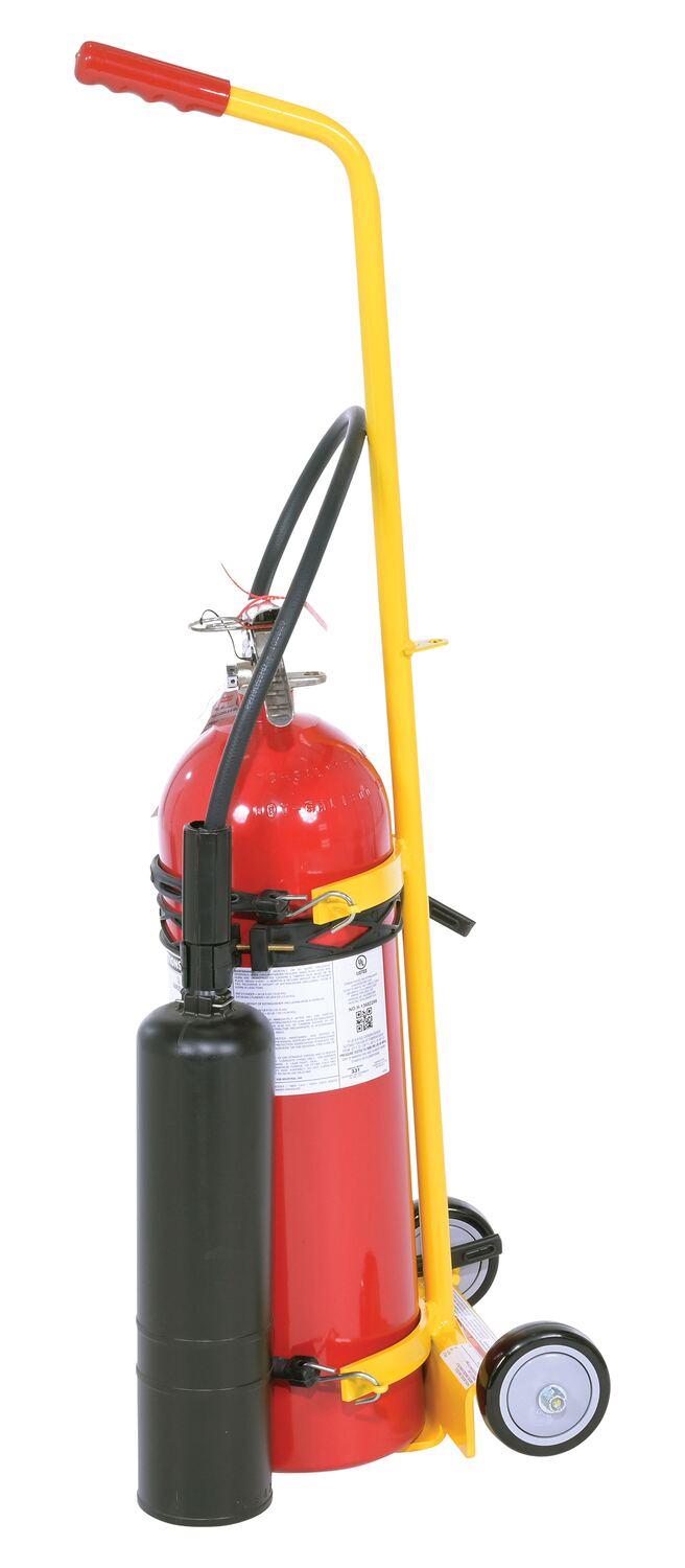 The Fire Extinguisher Carrier, model FEC-1, is designed for easily transporting your fire extinguisher up to 8" in diameter. Includes two (2) heavy duty adjustable rubber straps. Sturdy handle with rubber grip and poly casters for tilt-n-go portability. Welded steel construction with yellow baked-in powder-coat toughness. 4" x 2" stabilizing plate keeps unit upright when empty and helps retain extinguisher. Adjustable EPDM restraining straps keep extinguisher secure and allow for quick access. Wall mount bracket included to store the extinguisher off the floor.