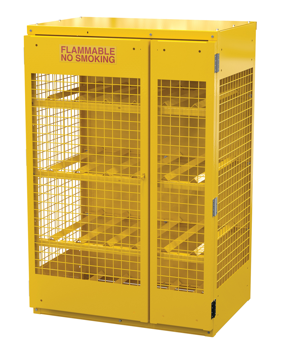 Steel cabinets for storage of cylinders. Cylinder storage capacity is based on cylinder size. Sides are made of expanded steel for an open view design. The top, back, and bottom is made of solid sheet steel. Lockable doors protect cylinders (padlock not included). Base includes lag holes for securing cylinders. Vertical units include chains for securing cylinders. Includes red lettered signage noting "Flammable-No Smoking" contents. Meets OSHA 1910.110 (f)(6)(ii), ANSI NFPA 55 + 58 and CGA P-1 design standards. Rugged steel construction with a baked-in powder coated safety yellow finish for toughness. Knock down versions available, suffix -KD Check out Vestil's Other Storage Cabinets: