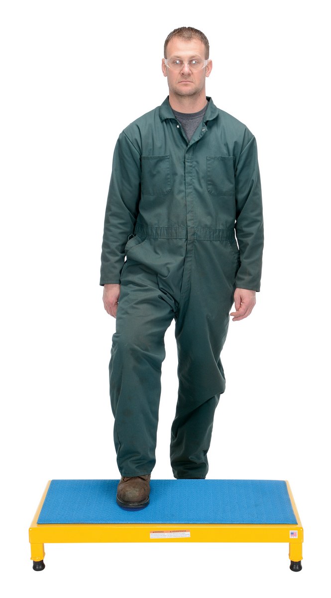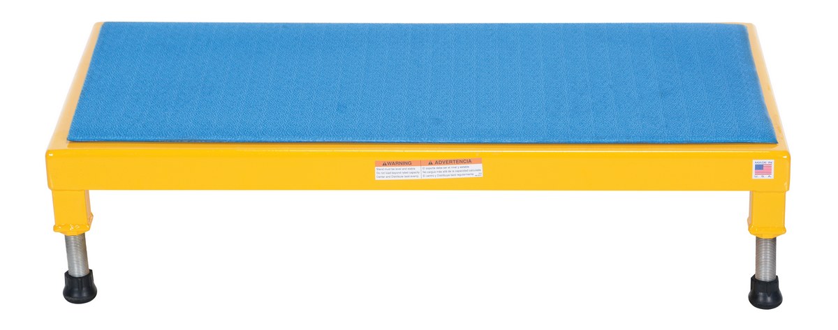 Steel Adjustable Work-Mate Stand 36 In. x 19 In. x 6-3/4 In. 500 Lb. Capacity YellowThe adjustable work-mate stand minimizes fatigue by elevating workers to heights that are comfortable and ergonomically correct. Especially useful when multiple shift employees operate the same piece of machinery. The ergonomic matting deck style provides comfort for the operator who stands all day. The height of each leg can be adjusted individually to ensure proper working height.