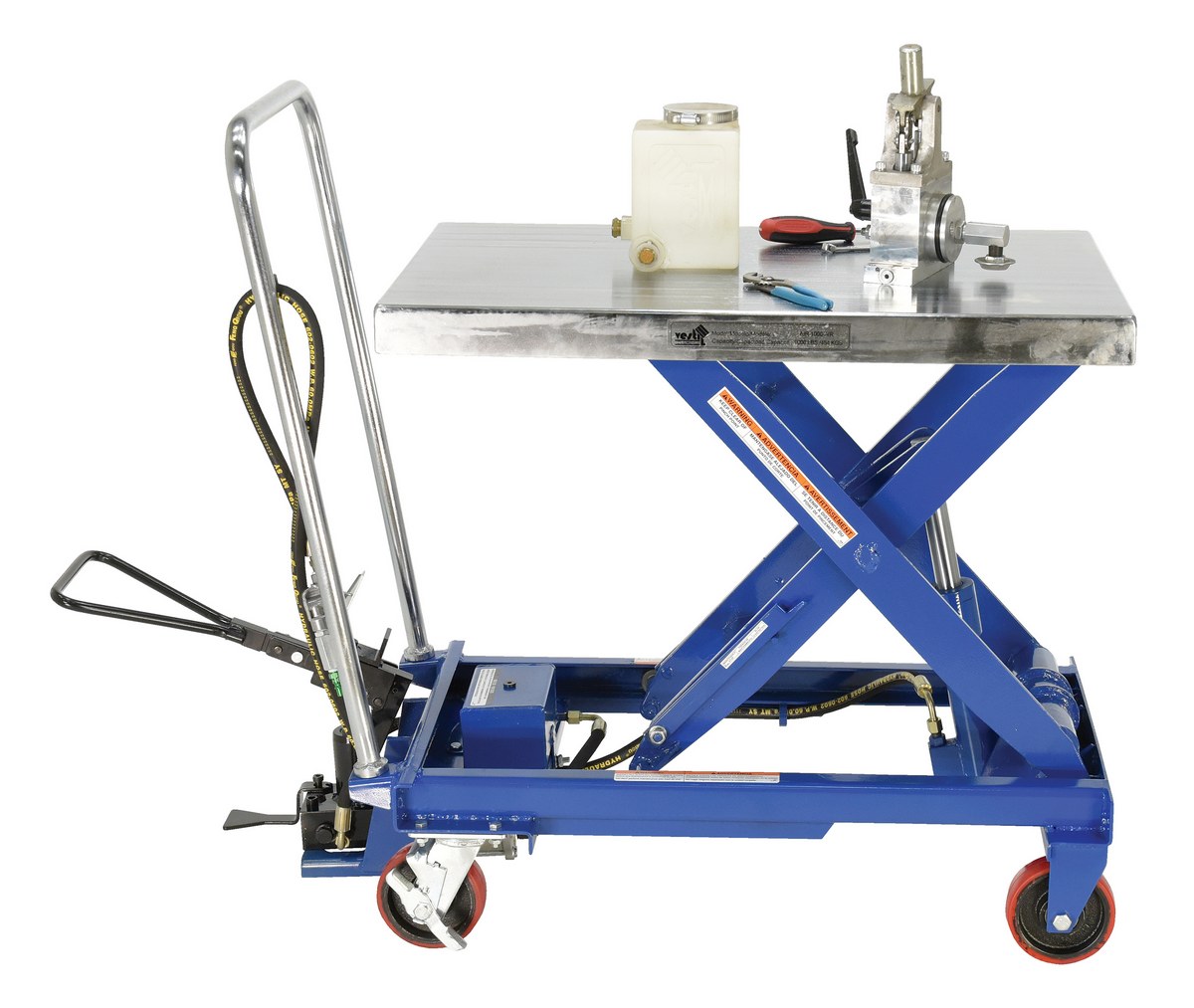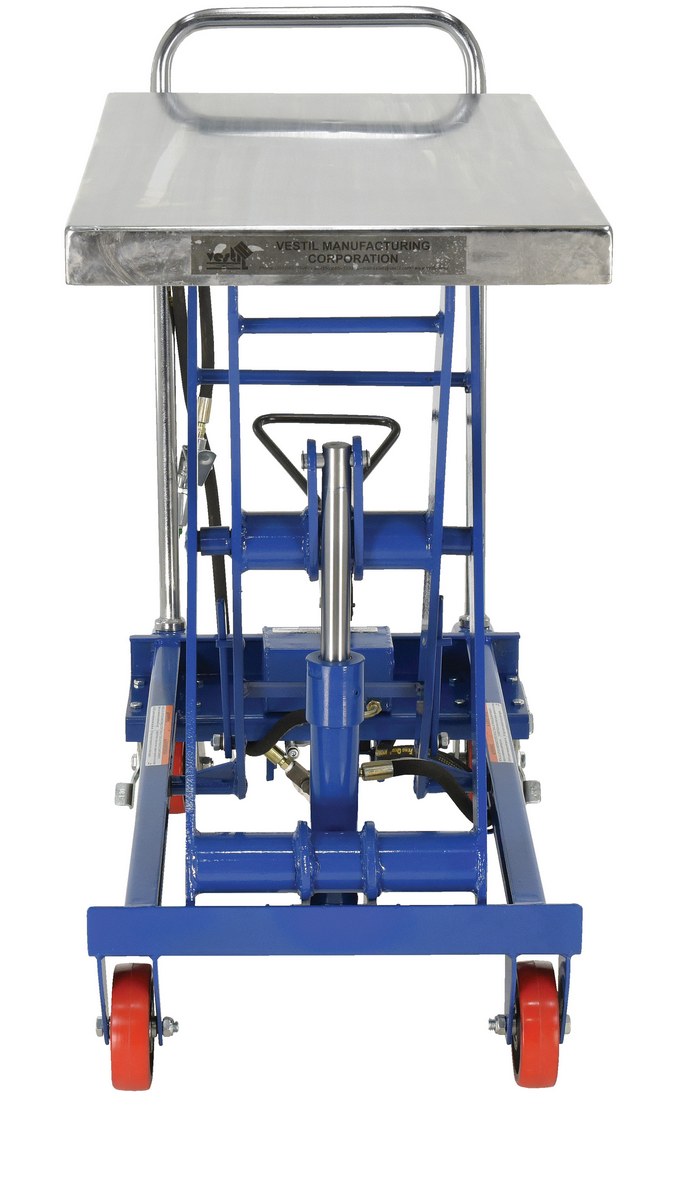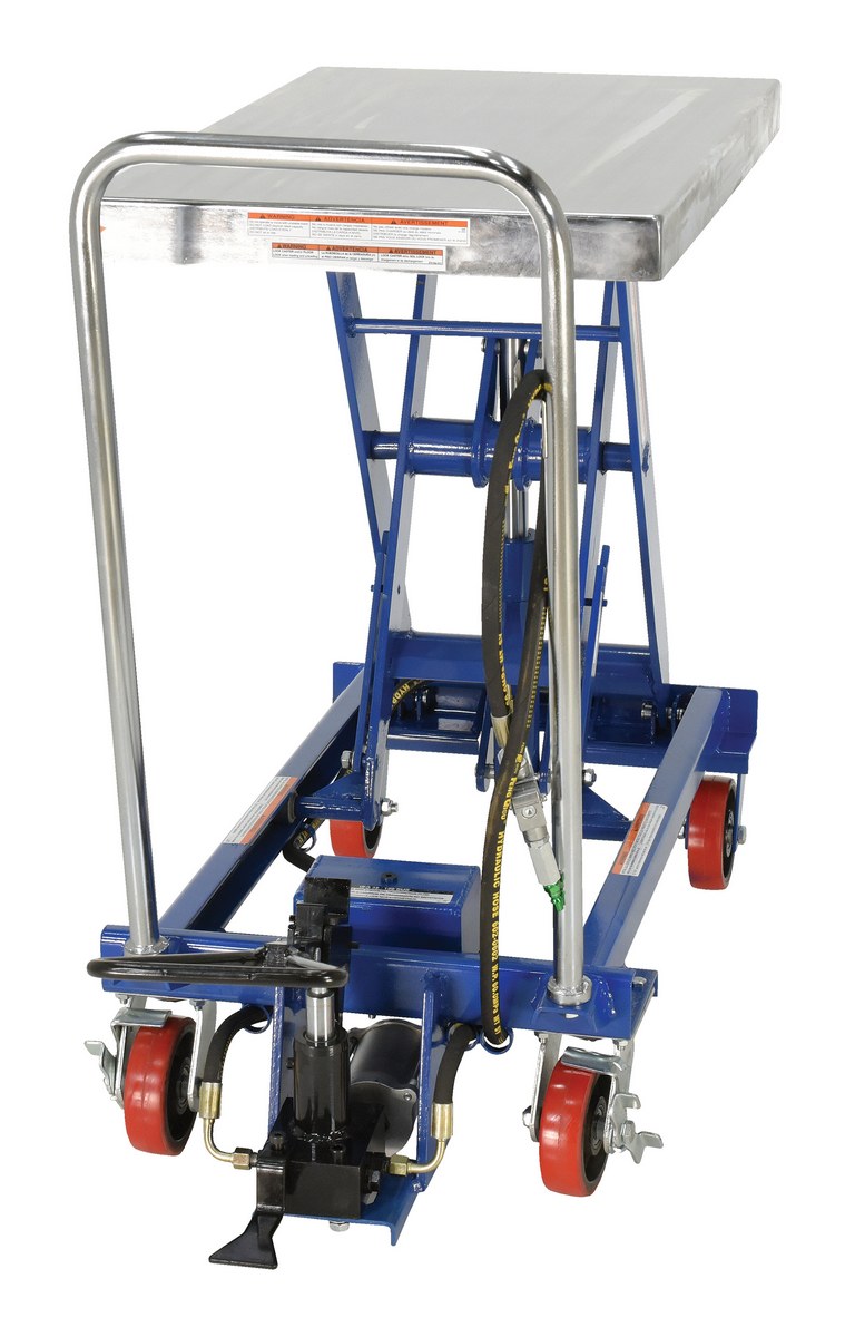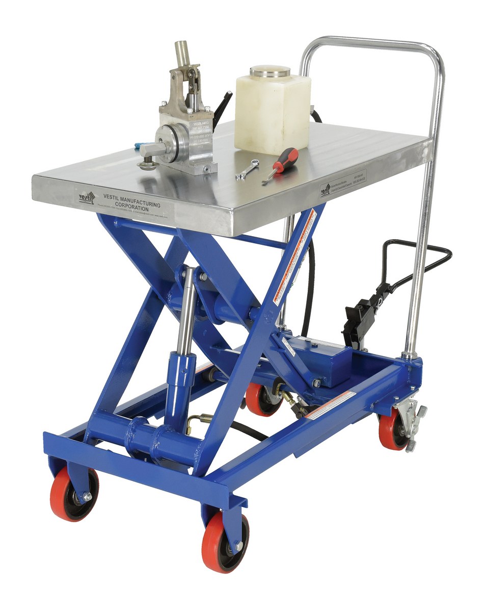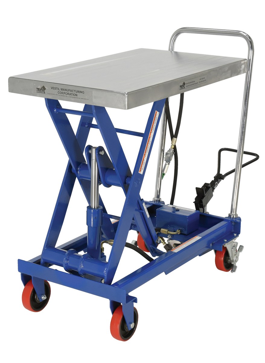 The air Hydraulic cart features a two speed foot pump and hand held reciprocating air/oil power to raise the platform. It utilizes the two speed foot pump for minor height adjustments and the factory air/oil power for effortless lifting.