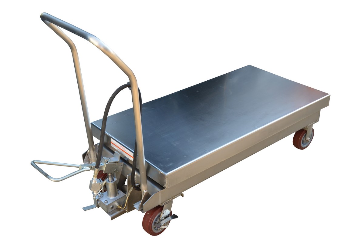 The air Hydraulic cart features a two speed foot pump and hand held reciprocating air/oil power to raise the platform. It utilizes the two speed foot pump for minor height adjustments and the factory air/oil power for effortless lifting. The platform, frame, handle, caster rigs, and hardware are all stainless steel. Pump assembly, hydraulic cylinder, and scissor legs are zinc plated.