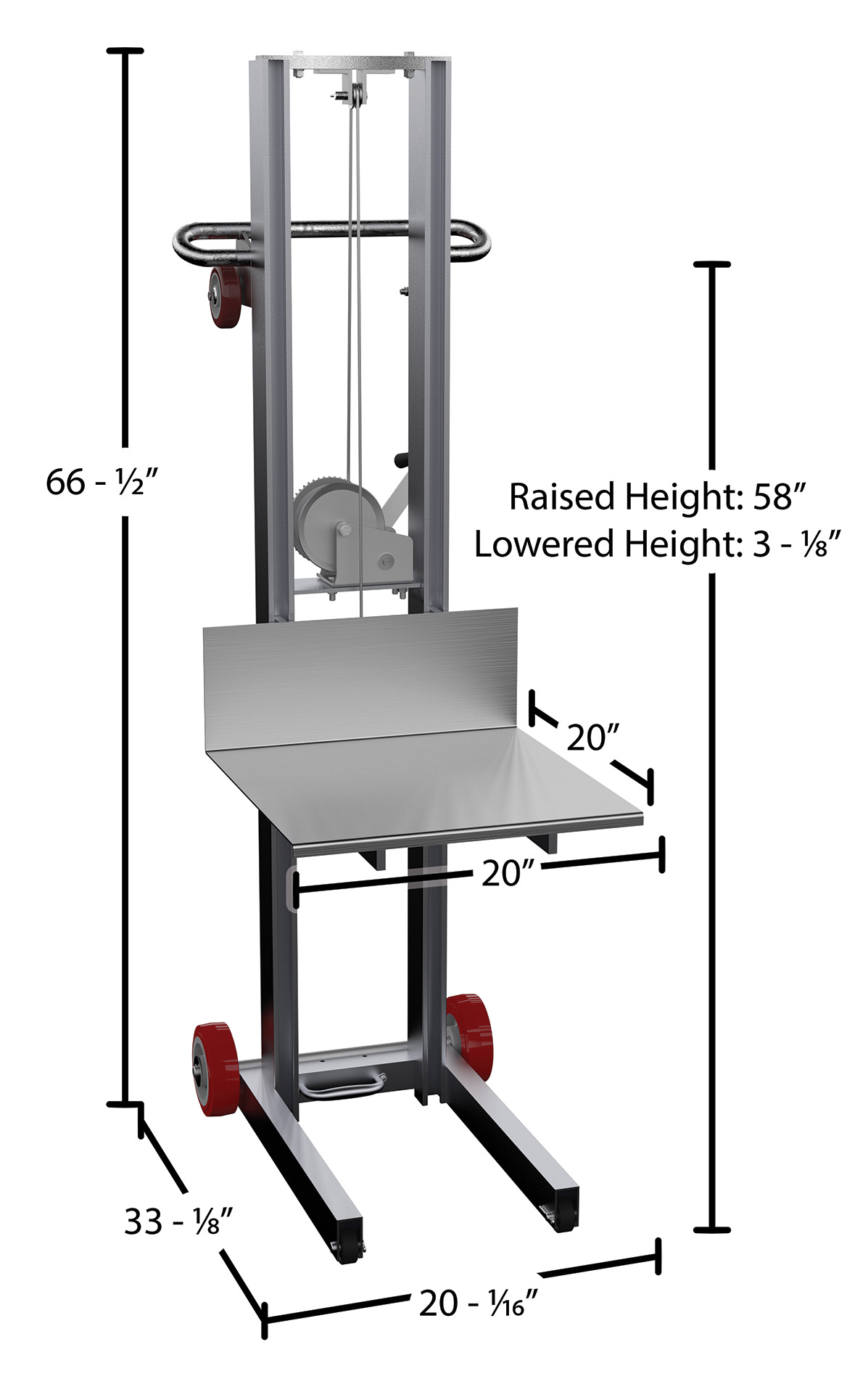 Aluminum Lite Load Lift With Winch and Fixed Wheels 20 In. x 20 In. Platform 400 Lb. Capacity SilverThe Lite load lift is ideal for lifting and transporting loads from delivery trucks to docks, or use to inventory storage systems. The unit is easy to operate with a hand winch operation and aluminum construction. The unit rolls smoothly on poly-on-poly rear wheels and semi-steel front wheels. Located on the handle are two rollers to ease loading into delivery trucks.